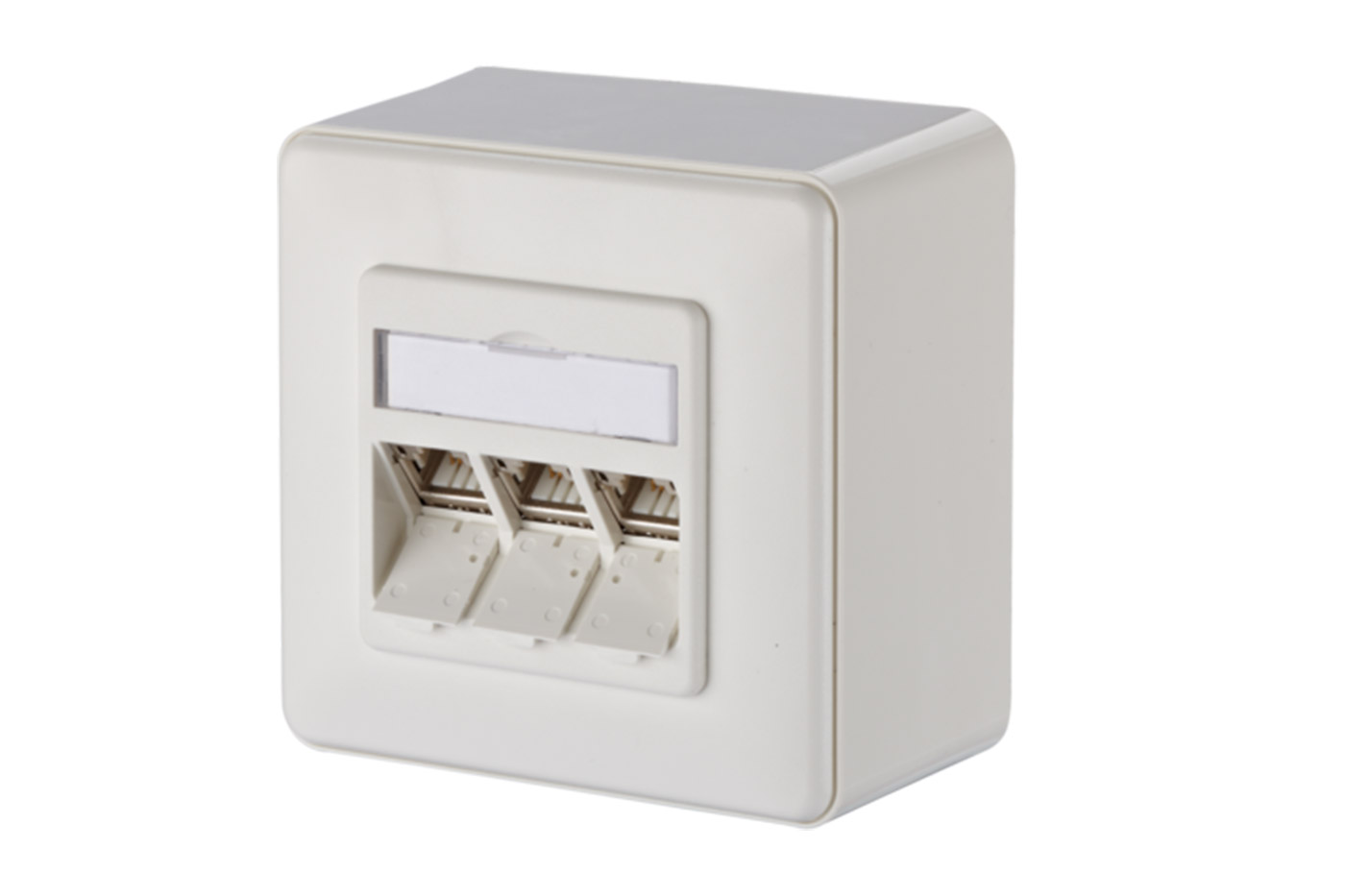 Stíněná zásuvka osazená 3x MC modulem kat. 6a 270°. Montáž na omítku.