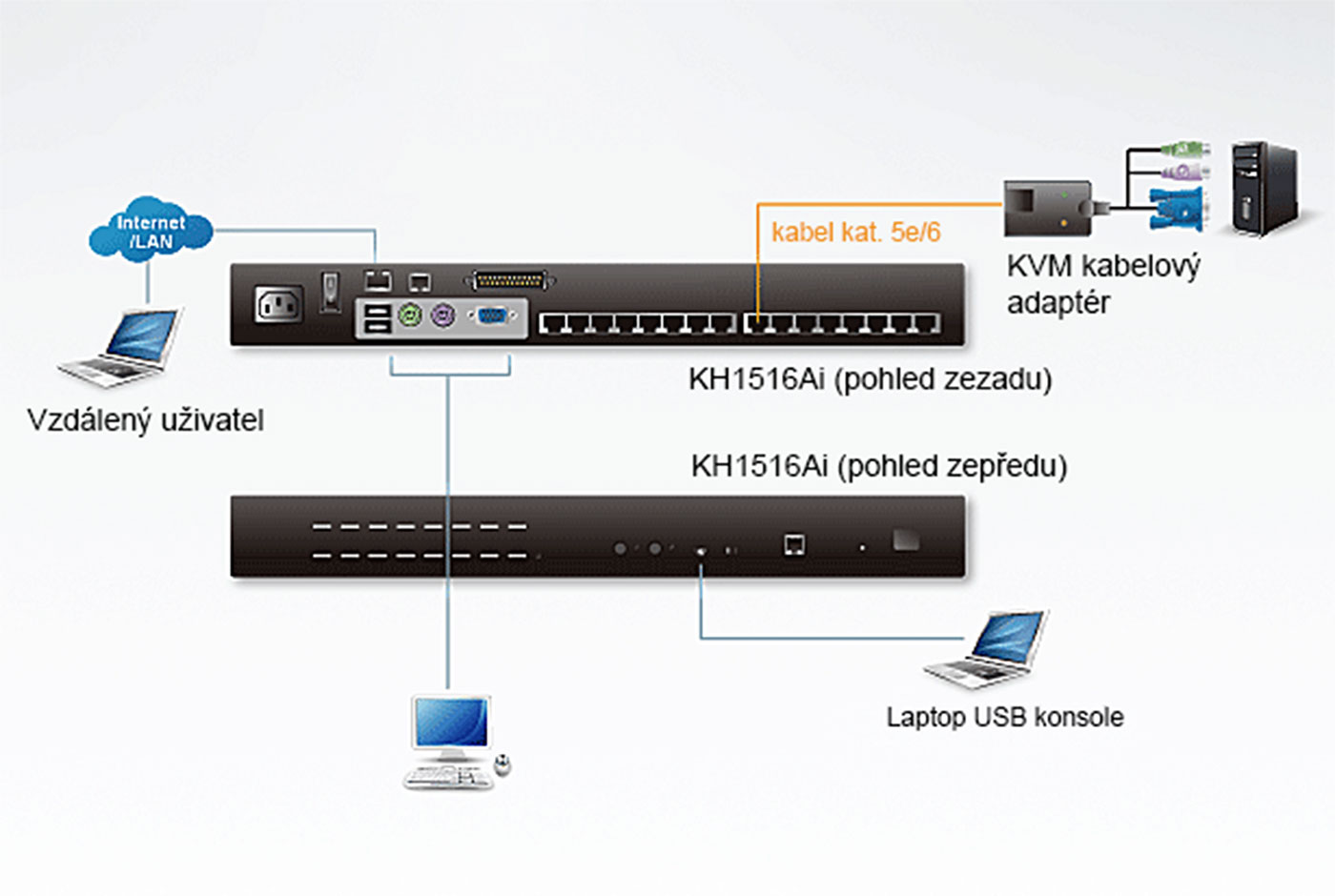 - Možnost kaskádování - celkem až 16 jednotek - tato jednotka(KH1516Ai) je schopna pracovat pouze na první úrovni. Na dalších úrovních lze použít přepínače ACS1208A, ACS1216A, CS1708, CS1716, CS1708A, CS1716A, KH1508, KH1516.