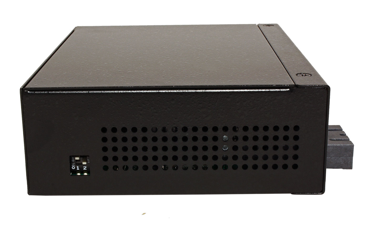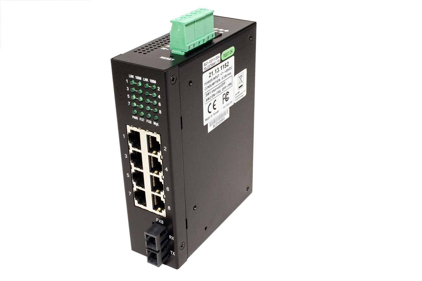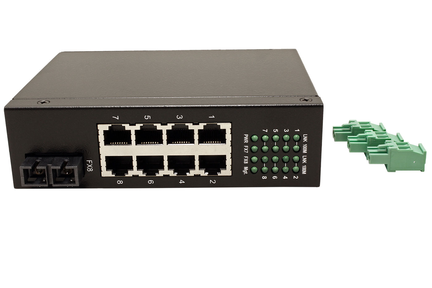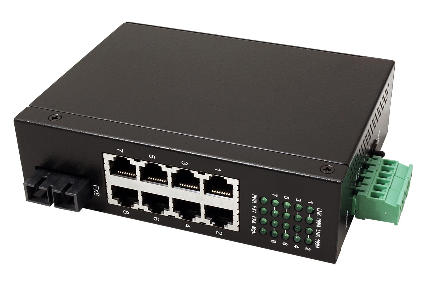 Kompaktní ethernet přepínač v kovovém provedení pro zvětšení počtu přípojných míst v síti. Je osazen celkem 8 porty 100Mb, z toho 1 port je v provedení RJ45 nebo 2x SC (sdílený). Použití ve ztížených podmínkách je umožněno odolným krytem s možností montáže na DIN lištu a velkým rozsahem napájení.