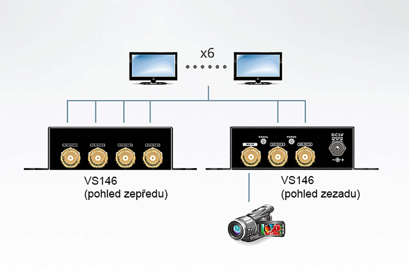 Pro rozbočení videosignálu z jednoho vstupu na 6 výstupů.