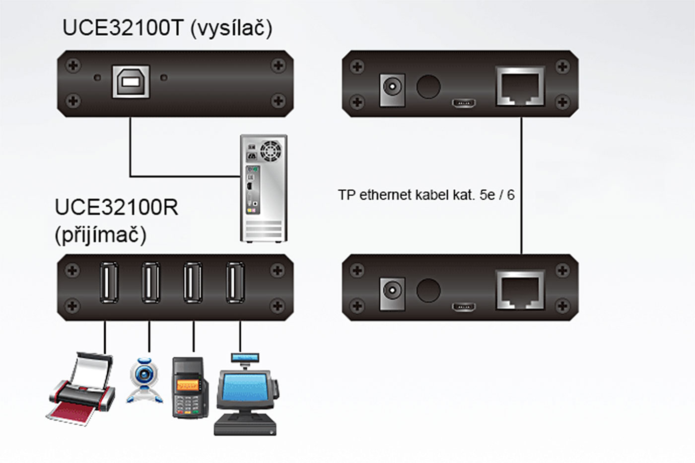 vysílač: USB B(F) / RJ45F / DC jack5,5x2,1F / microUSB B(F)