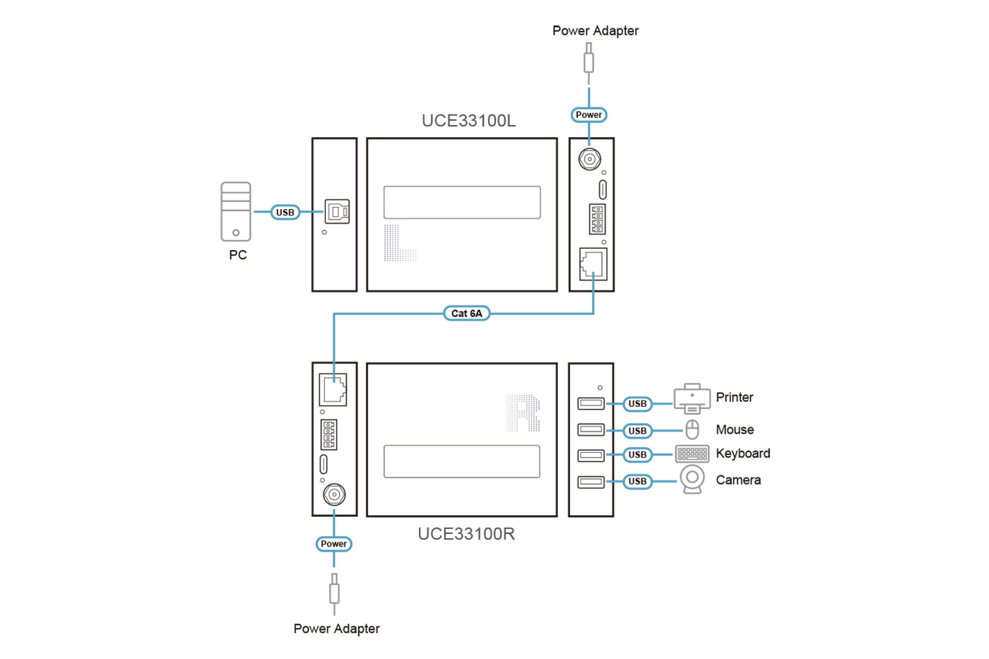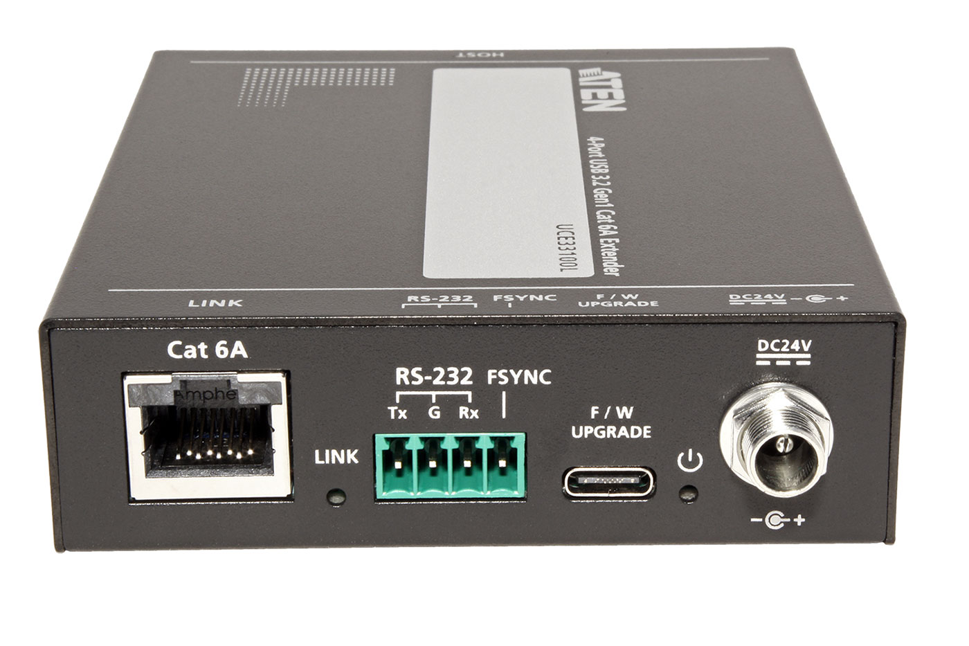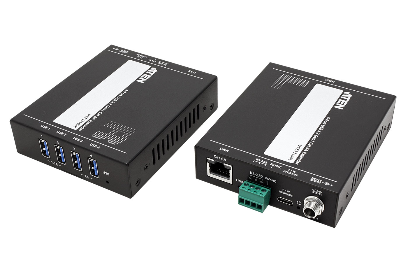 Prodlužovací adaptér (přijímač + vysílač), umožňující prodloužit USB 5Gbps (USB 3,2 gen 1) až o 100m přes TP kabel kategorie 6a. Se 4 portovým Hubem. Podporuje přenos RS232 a Frame Synchronization (FSYNC).