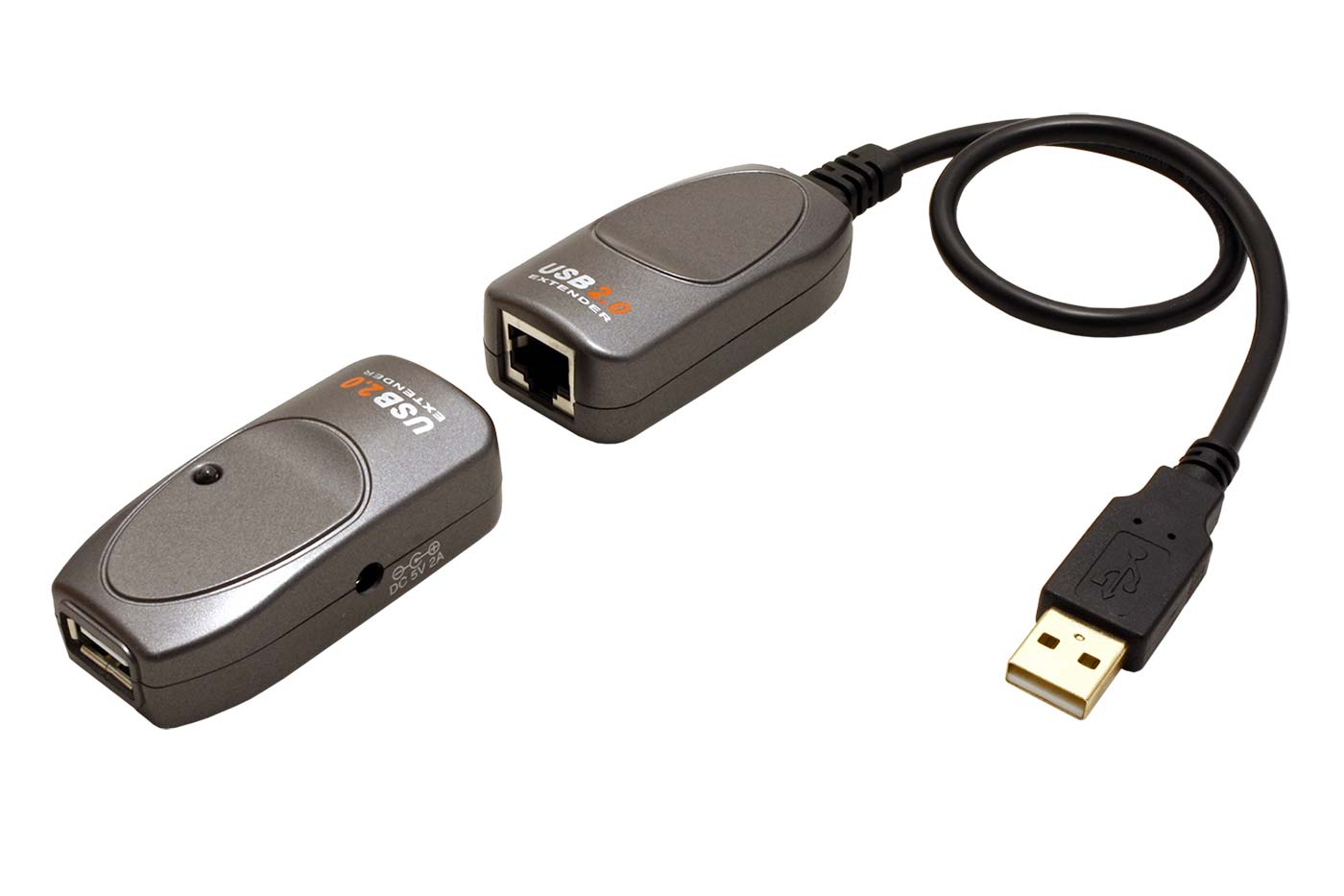 Prodlužovací adaptér (přijímač + vysílač), umožňující prodloužit USB až o 60m přes TP kabel kategorie 5e / 6 / 6a.;