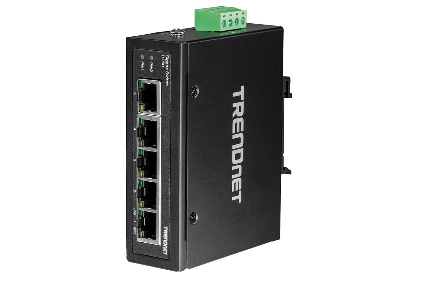 Kompaktní ethernet přepínač v kovovém provedení pro zvětšení počtu přípojných míst v síti. Je osazen celkem 5 porty 1Gb. Použití ve ztížených podmínkách je umožněno odolným krytem s možností montáže na DIN lištu, dvojitým nezávislým napájením a velkým rozsahem pracovních teplot.