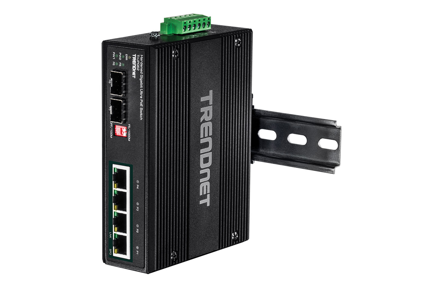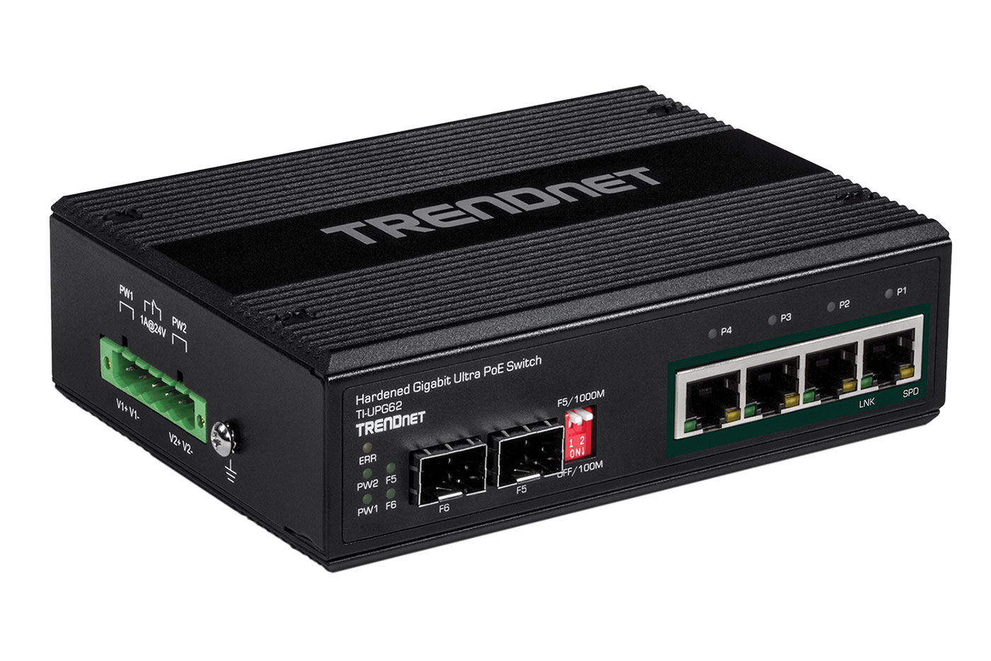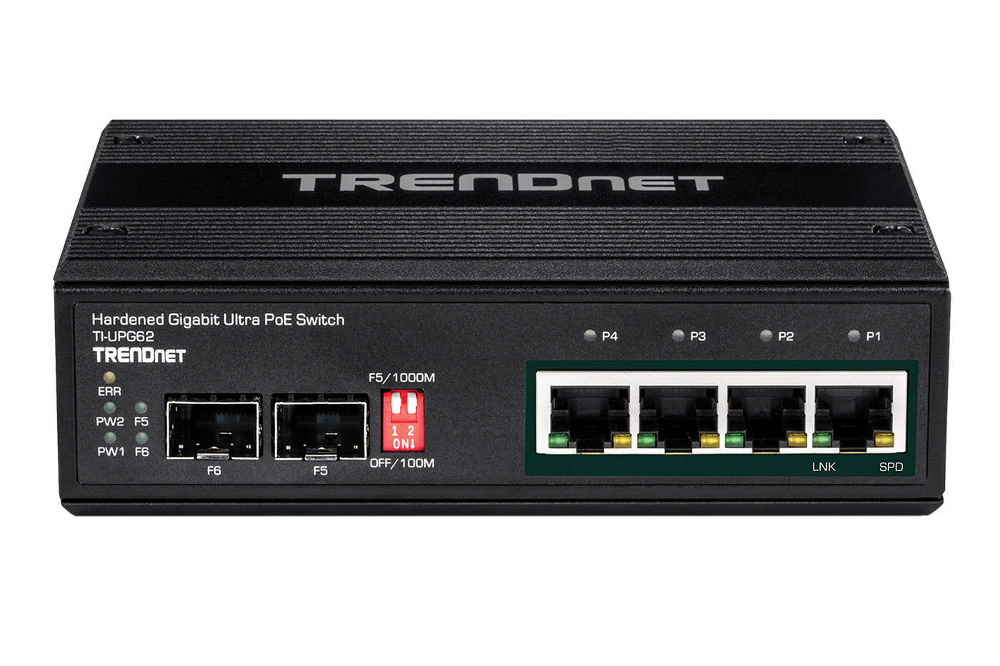TRENDnet Průmyslový ethernet přepínač 1Gb, 6 portů (4x RJ45 +2x SFP), 4x ultra POE, na DIN lištu (TI-UPG62)