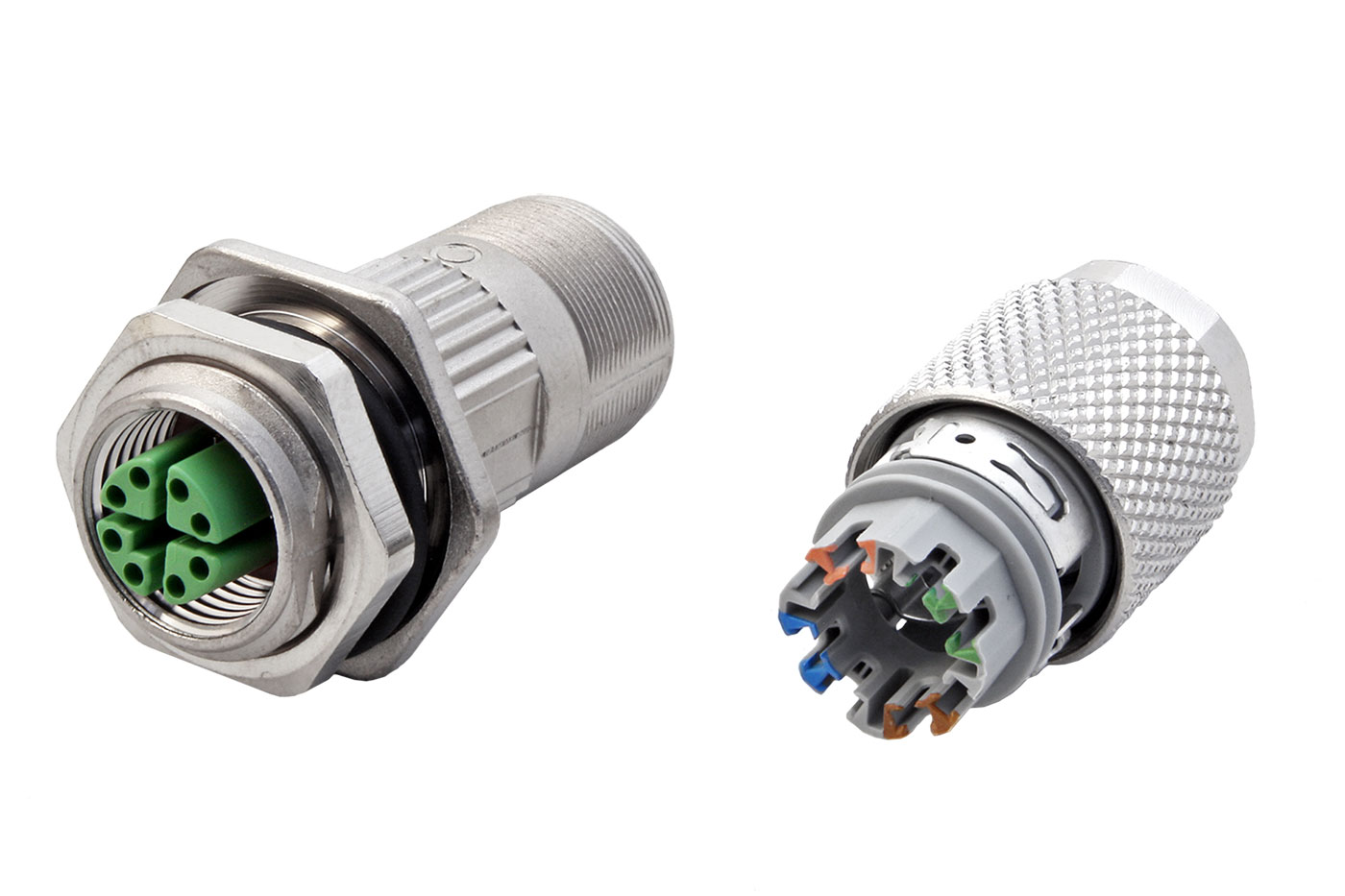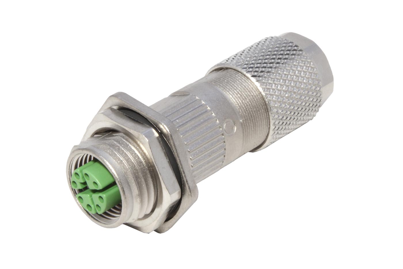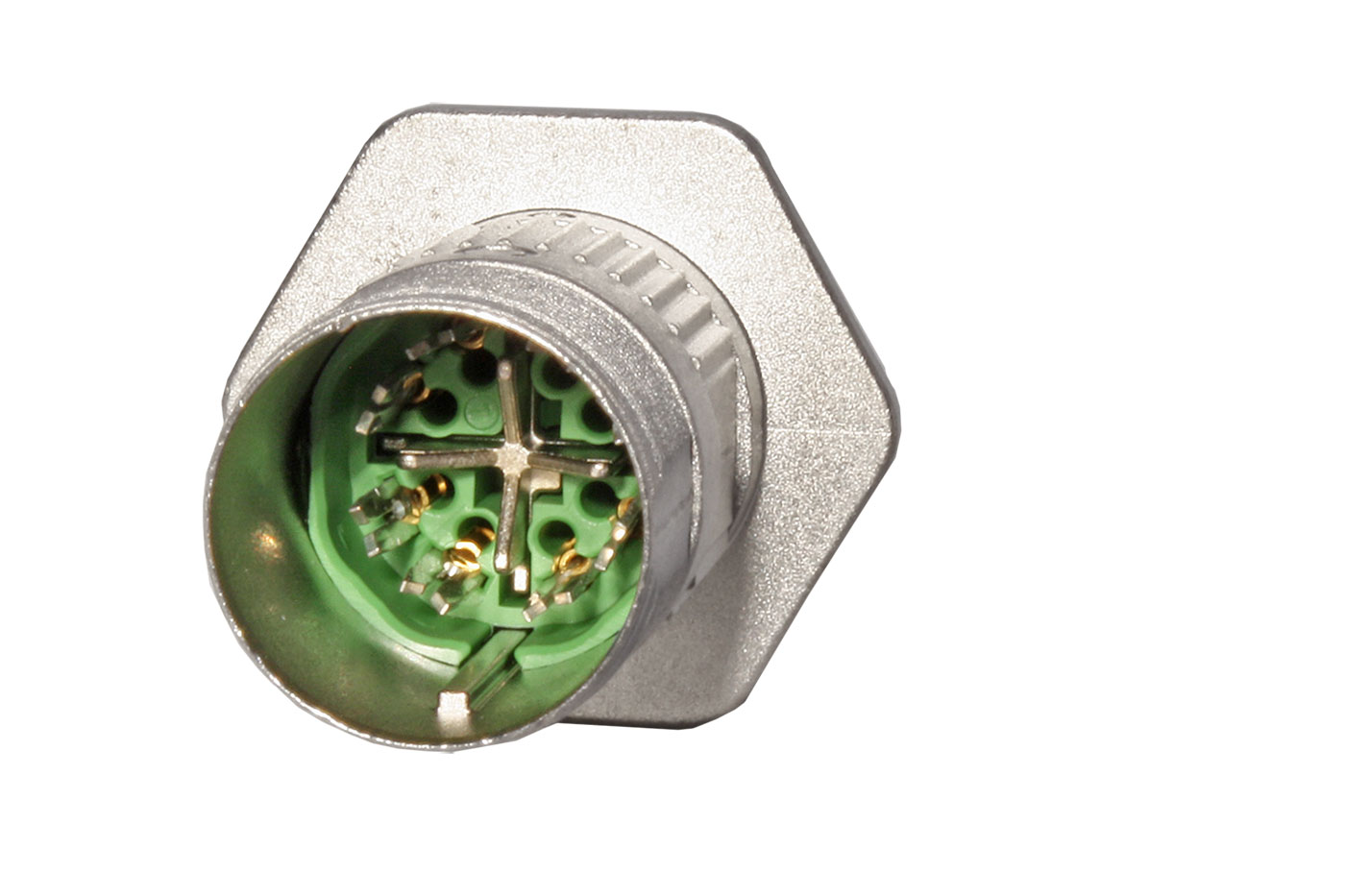 Kulatý 8 pinový konektor s přírubou pro Ethernet, kód X, samice, se šroubovým upevněním M12 a kovovým krytem.