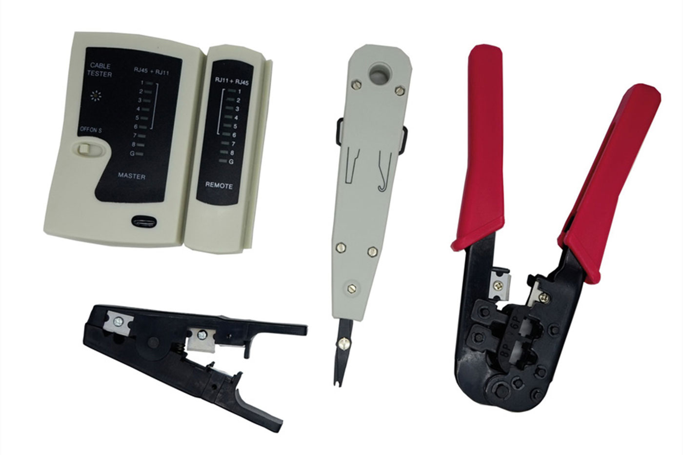 Obsah baleníKleště na konektory RJ45, nářezový nástroj na LSA+ konektory, odizolovávací kleště, tester kabelů.