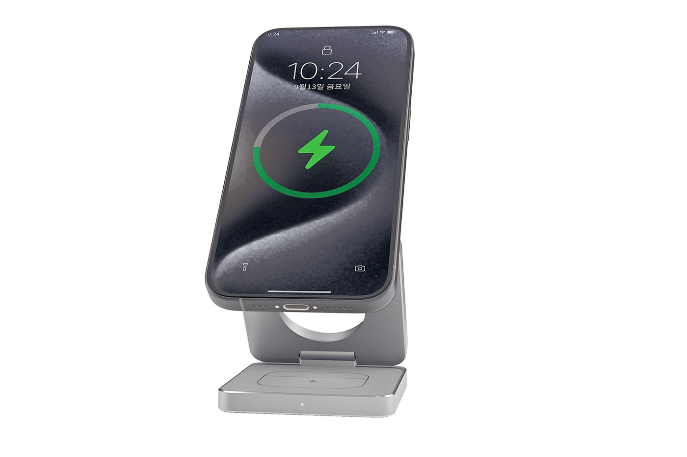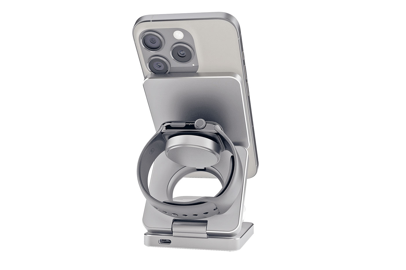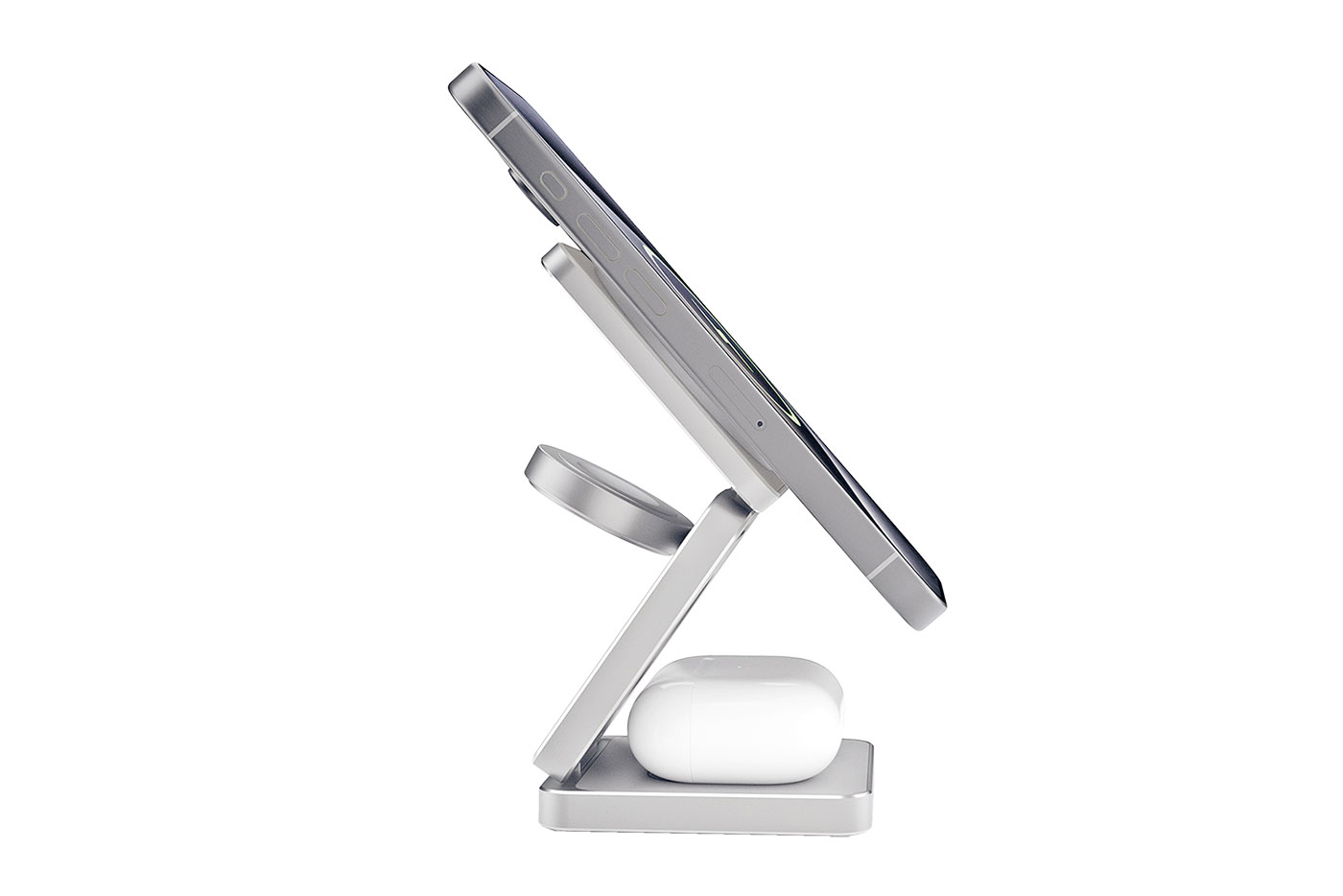 Elegantní skládací stojánek pro bezkontaktní nabíjení mobilních zařízení, podporujících standard Qi. Obsahuje 3 nabíjecí plochy, určené pro nabíjení telefonu, hodinek a sluchátek zároveň. Základna pro telefon podporuje i MagSave zařízení. Navrženo pro zařízení Apple - telefon a sluchátka nabíjí jakákoliv, ale hodinky pouze Apple. Pro fungování je nutný externí zdroj.