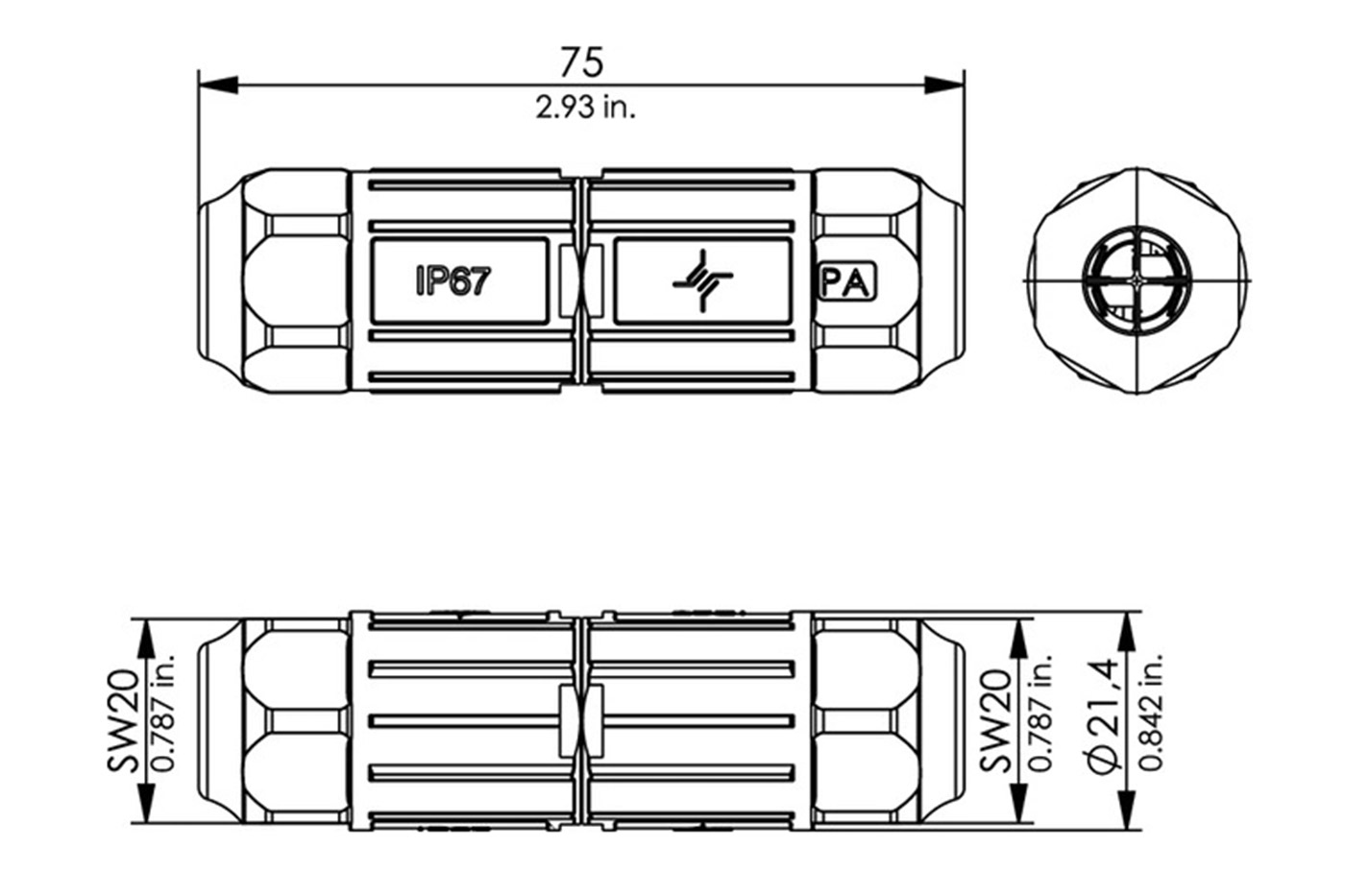 Spojka pro kabely s krytím IP67.;