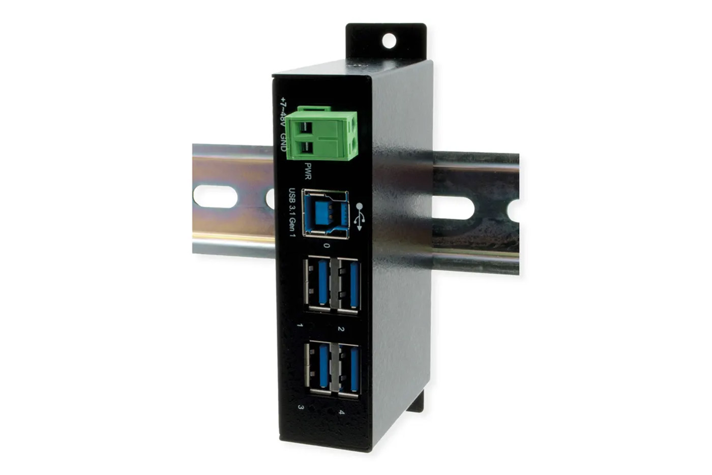 Spravovatelný USB 5Gb/s (USB 3.2 Gen.1 / USB 3.0) rozbočovač se 4 porty USB 3.2 Gen 1, určený pro montáž na DIN lištu.;