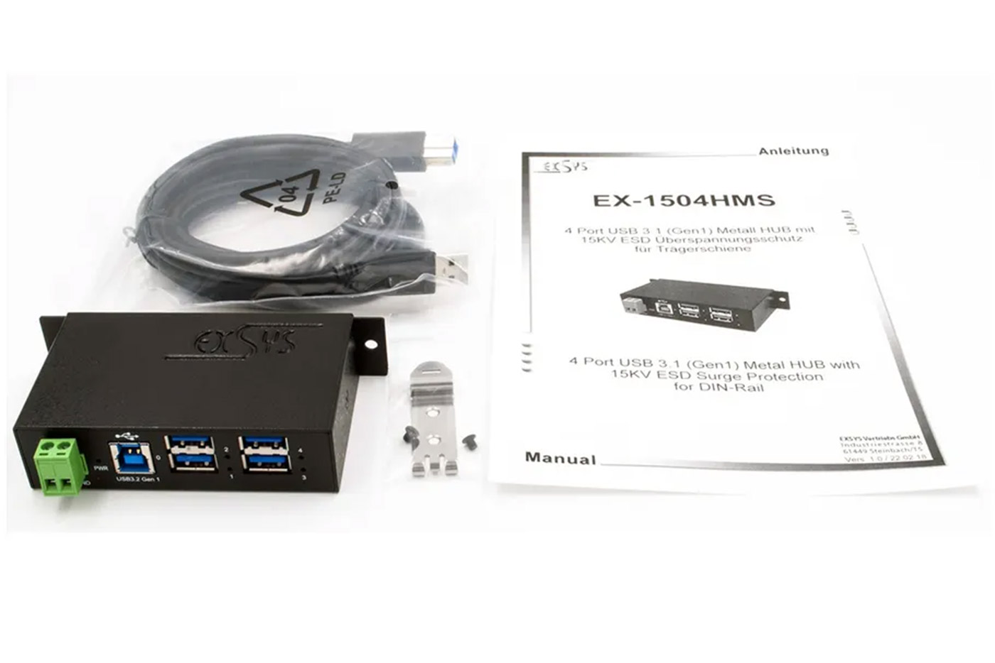 Obsah baleníUSB HUB, kabel USB30 A(M) - USB30 B(M) 1,5m, adaptér na DIN lištu, CD