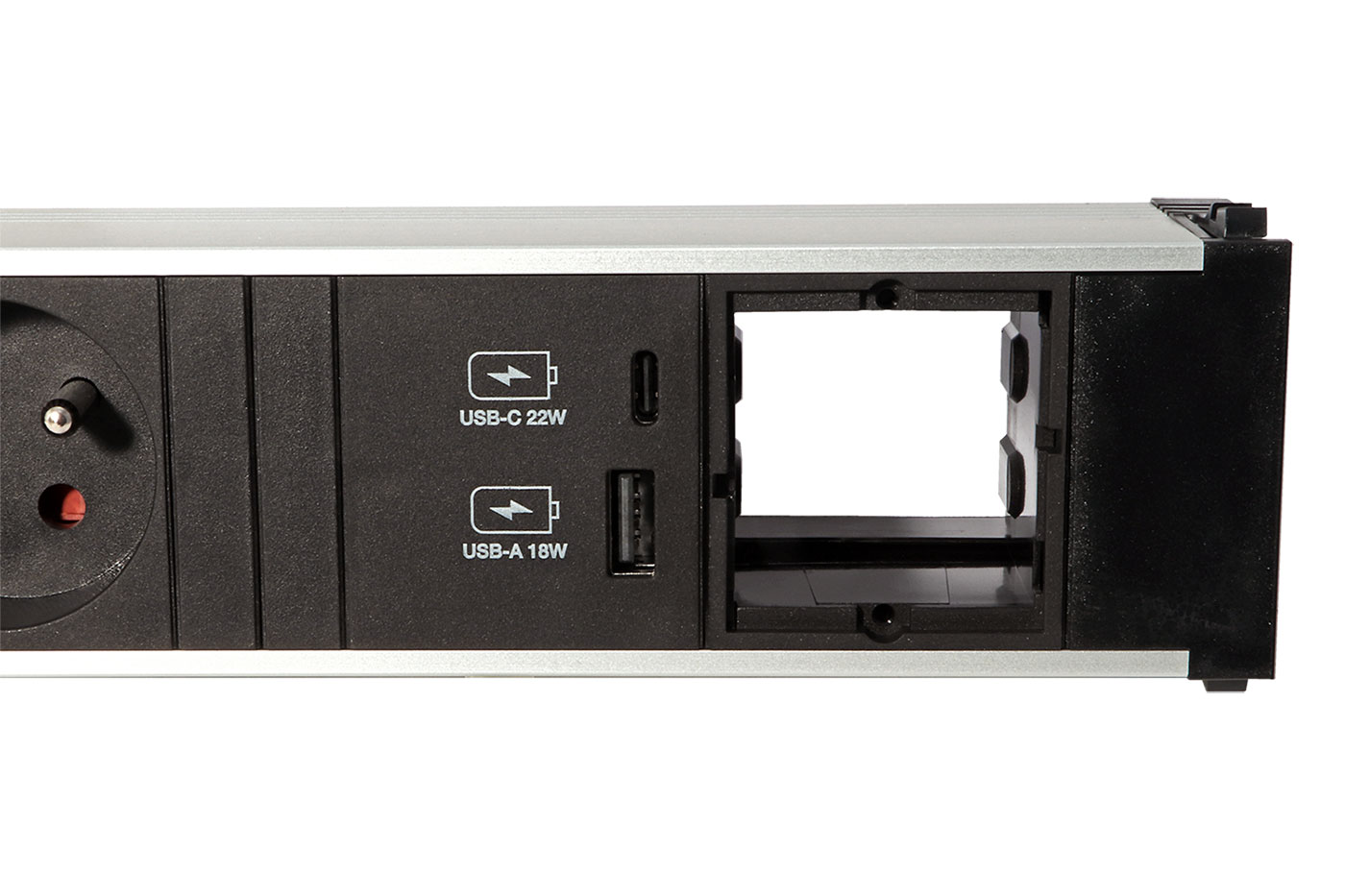 Box s 1 zásuvkou CZ, napájecím modulem 22W (USB A + USB C) a pozicí pro jeden uživatelsky konfigurovatelný modul. Je určený pro montáž do krátkého rámu systému CONI.