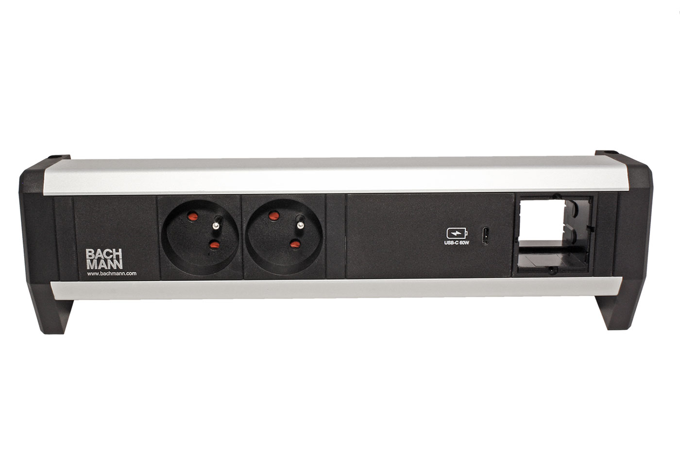 Použití: Elegantní pevné přípojné místo jednoduše montovatelné na stolní desku. Umožňuje snadnou montáž na okraj stolu, nebo na plochu stolu pomocí vrutů(nejsou součástí balení). Box se 2 zásuvkami CZ, napájecím modulem 60W (1x USB C)a jednou volnou pozicí pro uživatelsky konfigurovatelný modul. Je vybaven bočnicemi pro upevnění na stůl.;