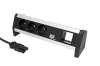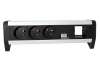 Elegantní pevné přípojné místo jednoduše montovatelné na stolní desku. Umožňuje snadnou montáž na okraj stolu, nebo na plochu stolu pomocí vrutů(nejsou součástí balení). Box se 3 zásuvkami CZ a 1 volnou pozicí pro uživatelsky konfigurovatelné moduly. Je vybaven bočnicemi pro upevnění na stůl.