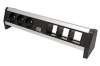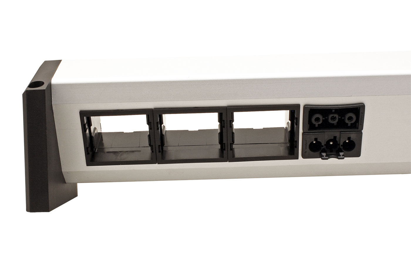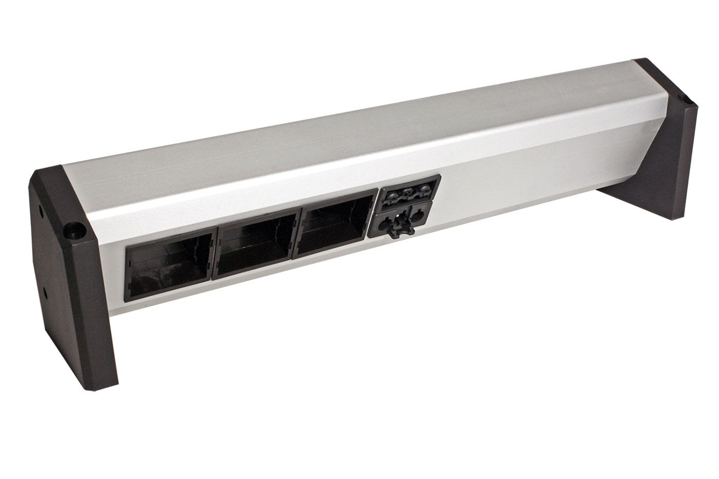 Elegantní pevné přípojné místo jednoduše montovatelné na stolní desku. Umožňuje snadnou montáž na okraj stolu, nebo na plochu stolu pomocí vrutů(nejsou součástí balení). Box se 3 zásuvkami CZ a 3 volnými pozicemi pro uživatelsky konfigurovatelné moduly. Je vybaven bočnicemi pro upevnění na stůl.