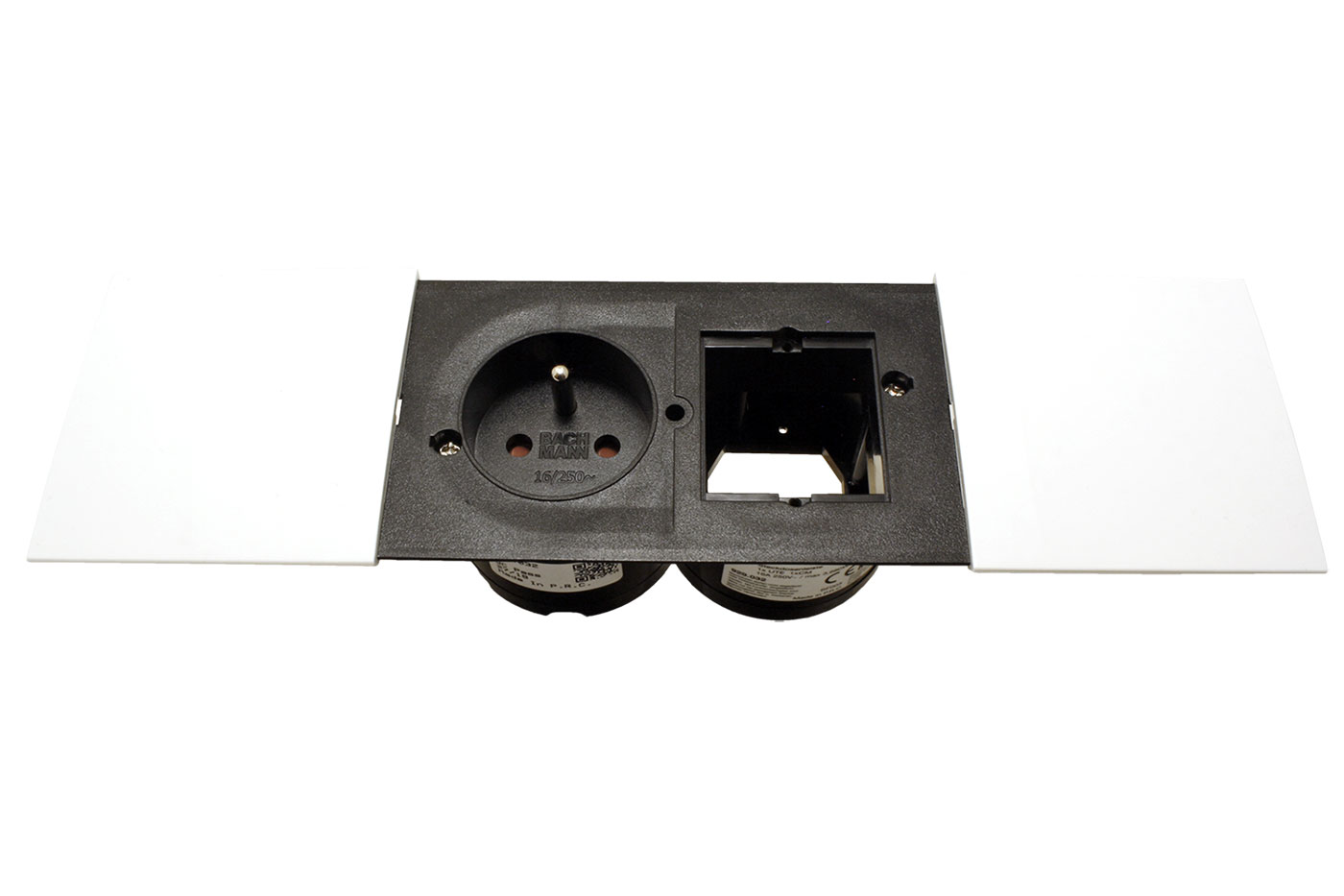 Elegantní kryt umožňující zakrýt přípojné místo pokud není používáno. Kryt se odsouvá do strany (mimo tělo zásuvky)