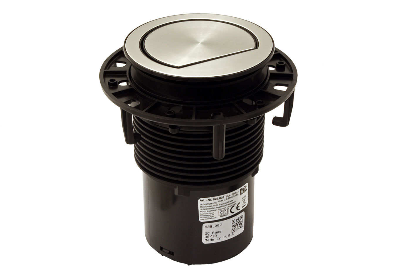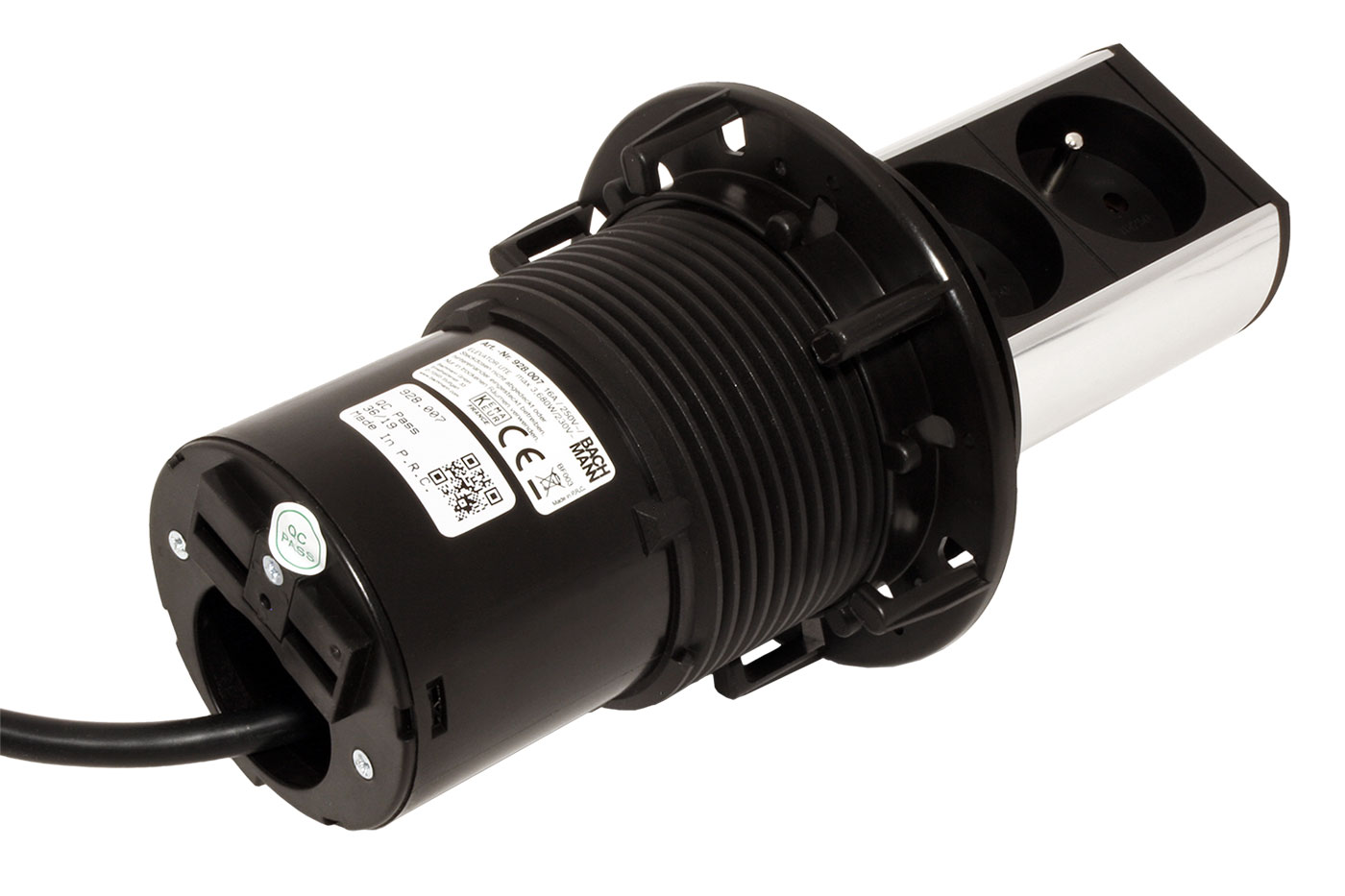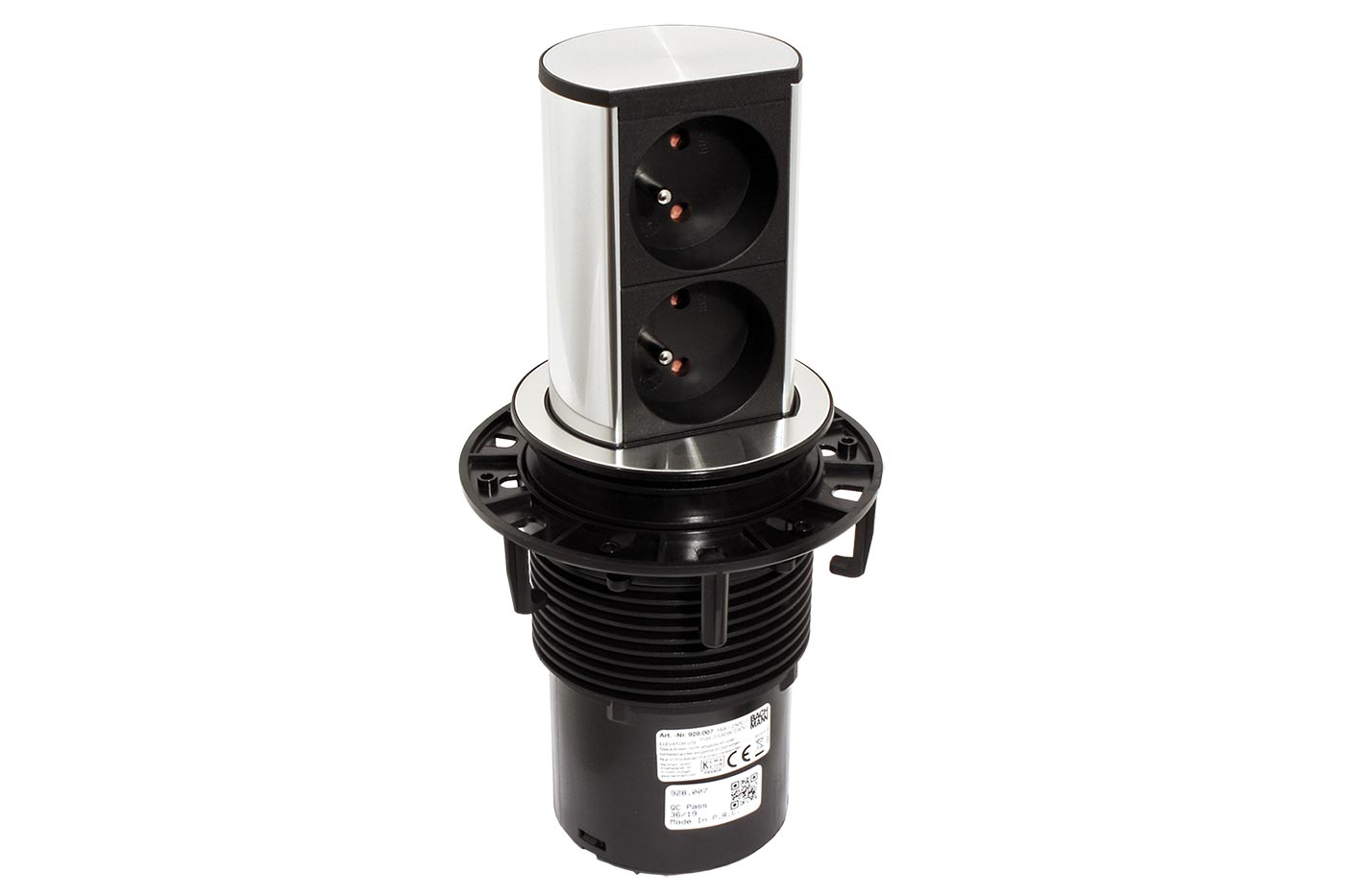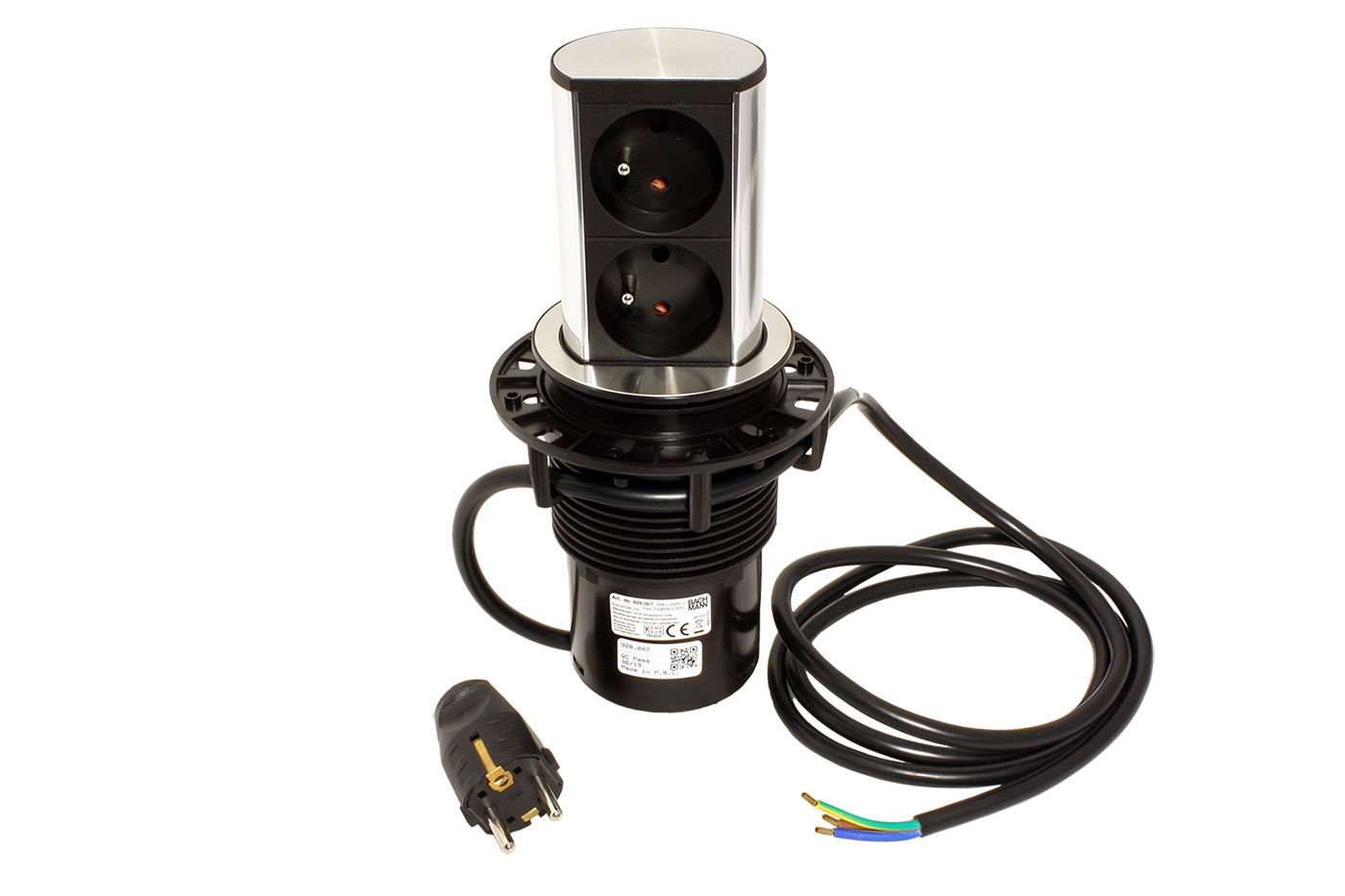 Použití: Elegantní výsuvný box se 2 napájecími zásuvkami, určený pro montáž do desky stolu. Po zasunutí vyčnívá pouze 2,5mm nad povrch.;