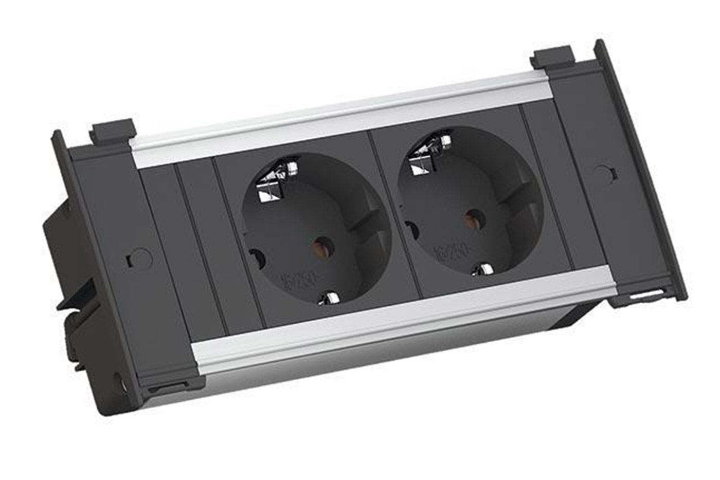 Stylový kompaktní box se dvěma napájecími zásuvkami DE, určený pro montáž do desky stolu, nábytku, nebo duté stěny (sádrokarton, OSB…)