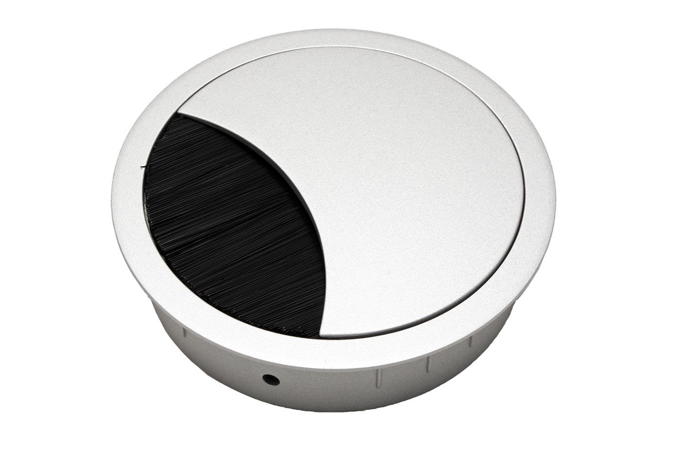 Kulatá průchodka do stolní desky s kartáčovým krytem.;