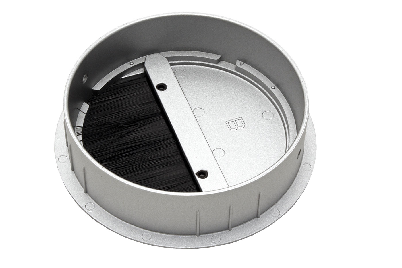Elegantní průchodka ze slitiny zinku a hliníku pro průchod kabeláže skrze desku stolu. Výřez v krytu krytky krytý kartáčem zabraňuje zapadávání drobných předmětů pod stůl.