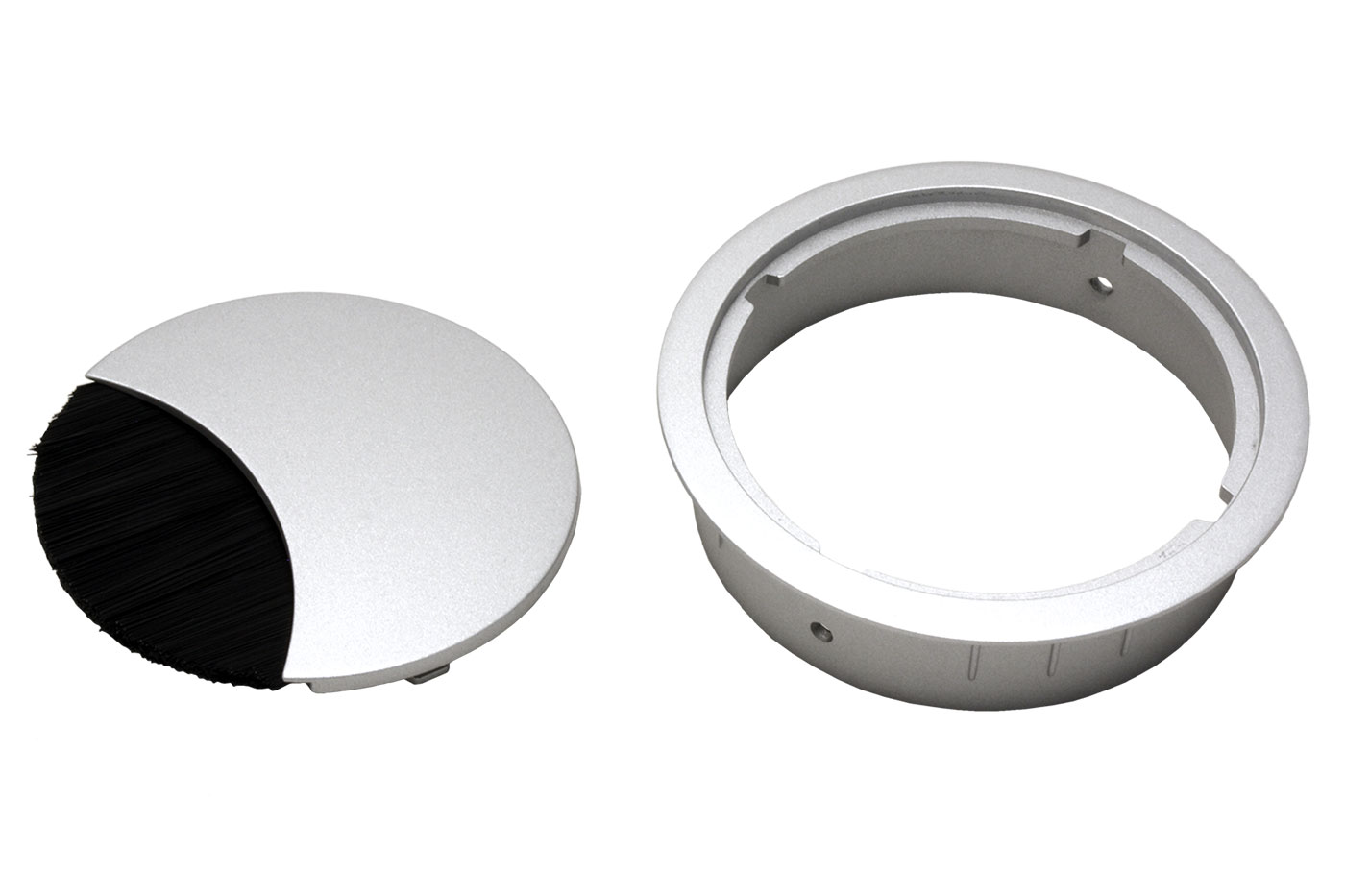 Použití: Elegantní průchodka ze slitiny zinku a hliníku pro průchod kabeláže skrze desku stolu. Výřez v krytu krytky krytý kartáčem zabraňuje zapadávání drobných předmětů pod stůl.;