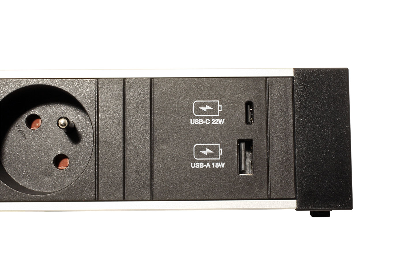 Box se 3 napájecími zásuvkami a 2 nabíjecími porty USB, určený pro montáž do středního rámu systému POWER FRAME.