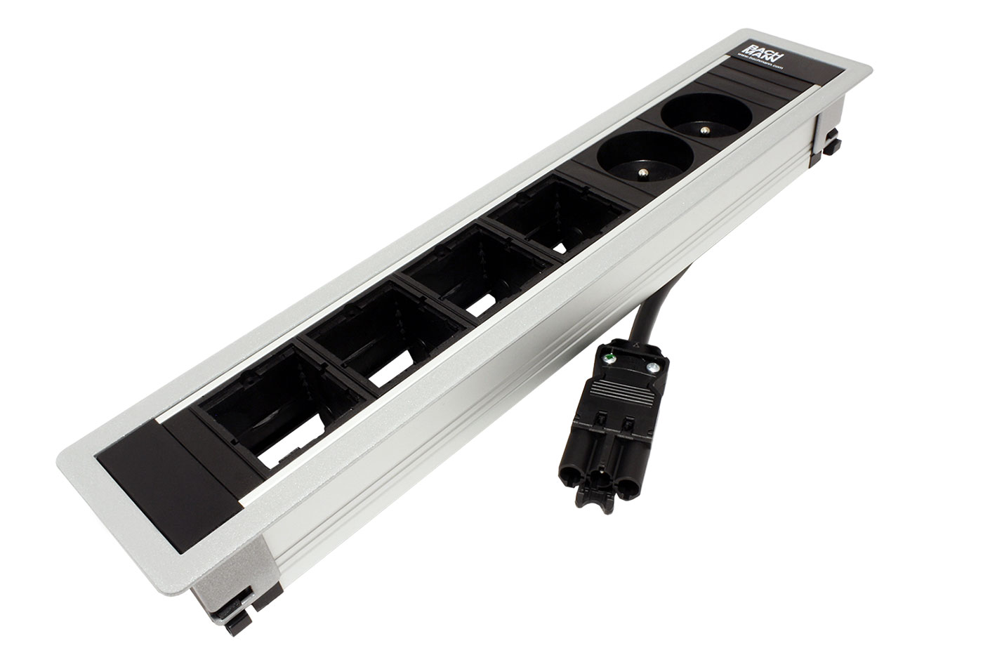 Elegantní přípojné místo v úrovni stolu. Umožňuje snadnou montáž do otvoru v desce stolu. Box s uživatelsky konfigurovatelnými moduly se jednoduše vkládá do držáku. Nízká vestavná hloubka dovoluje montáž i ve stísněných prostorech.