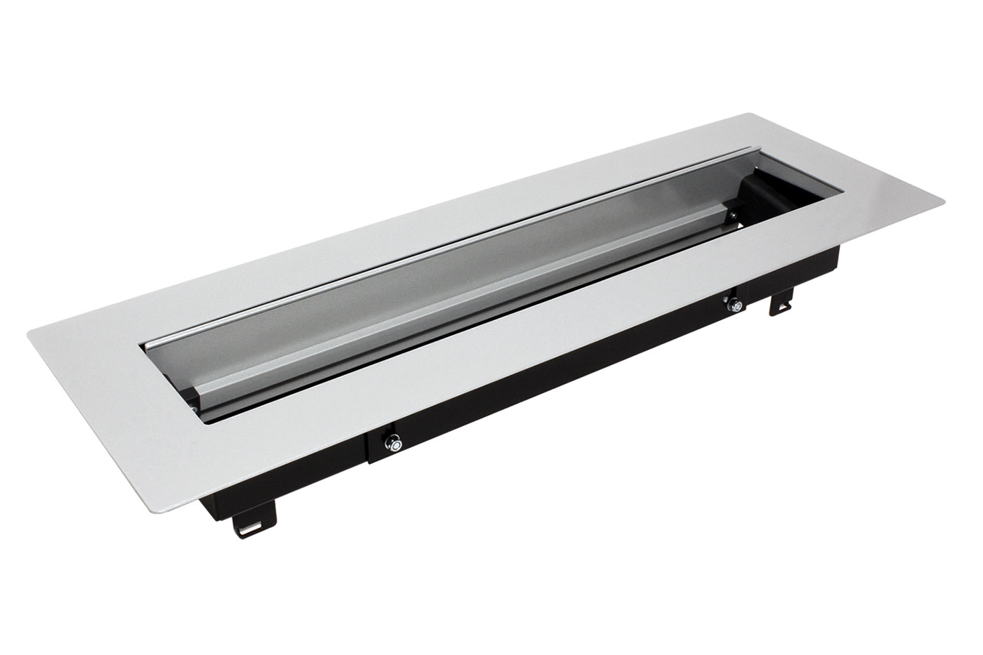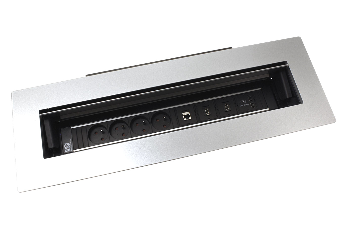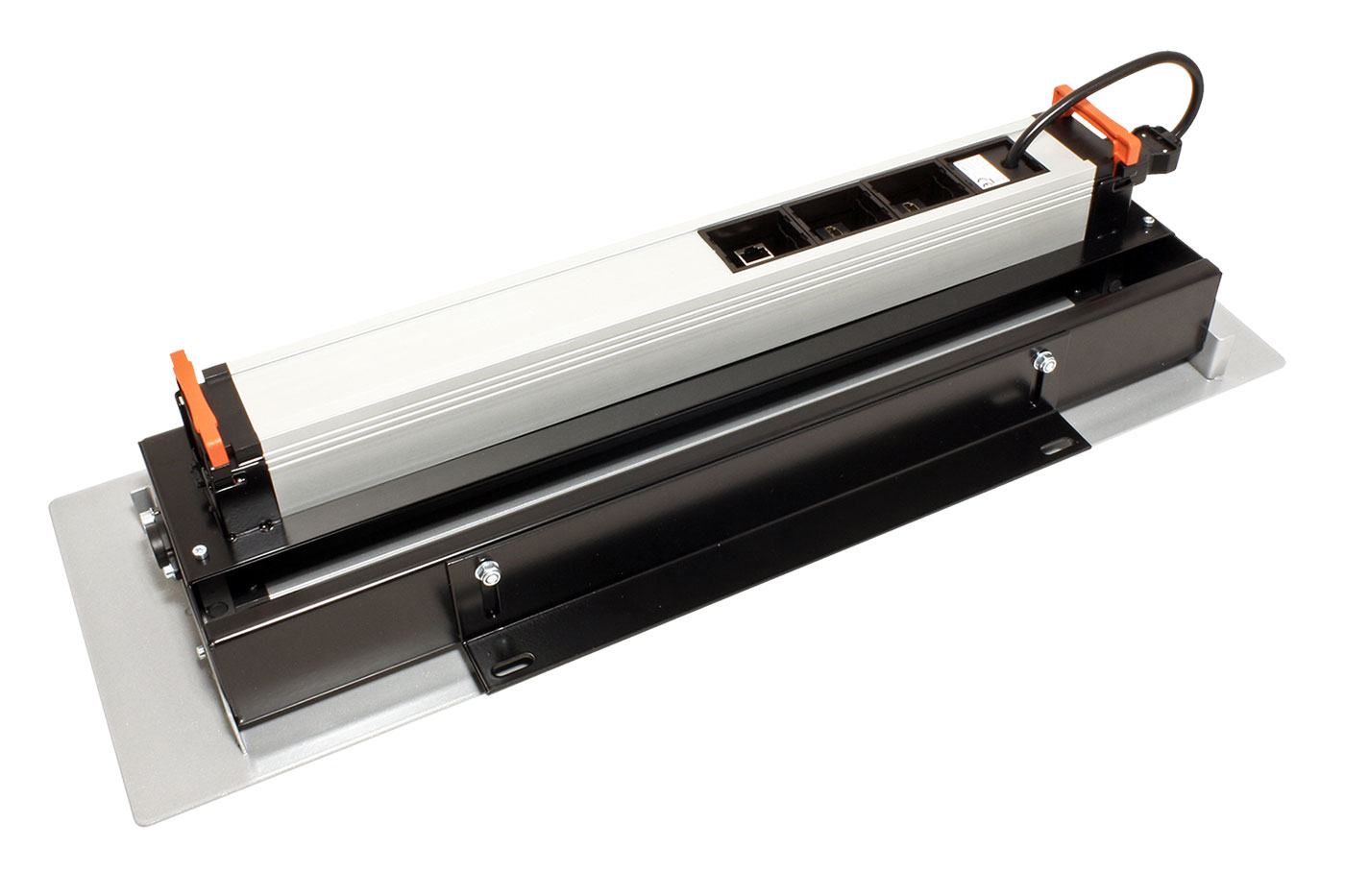 Elegantní přípojné místo v úrovni stolu. Umožňuje snadnou montáž do otvoru v desce stolu. Box s uživatelsky konfigurovatelnými moduly se jednoduše vkládá do držáku. Nízká vestavná hloubka dovoluje montáž i ve stísněných prostorech. Obsahuje rám, odklápěcí kryt boxu a symetrický vrchní rámeček.