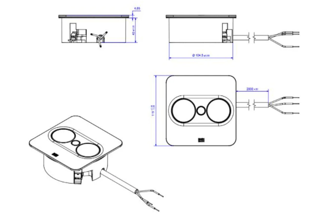 Použití: Box se 2 napájecími zásuvkami, určený pro montáž do desky stolu.;