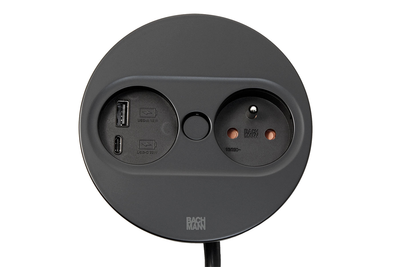 Přípojné místo systému TWIST 2 s napájecí zásuvkou a nabíjecími porty USB A a USB C 22W.;