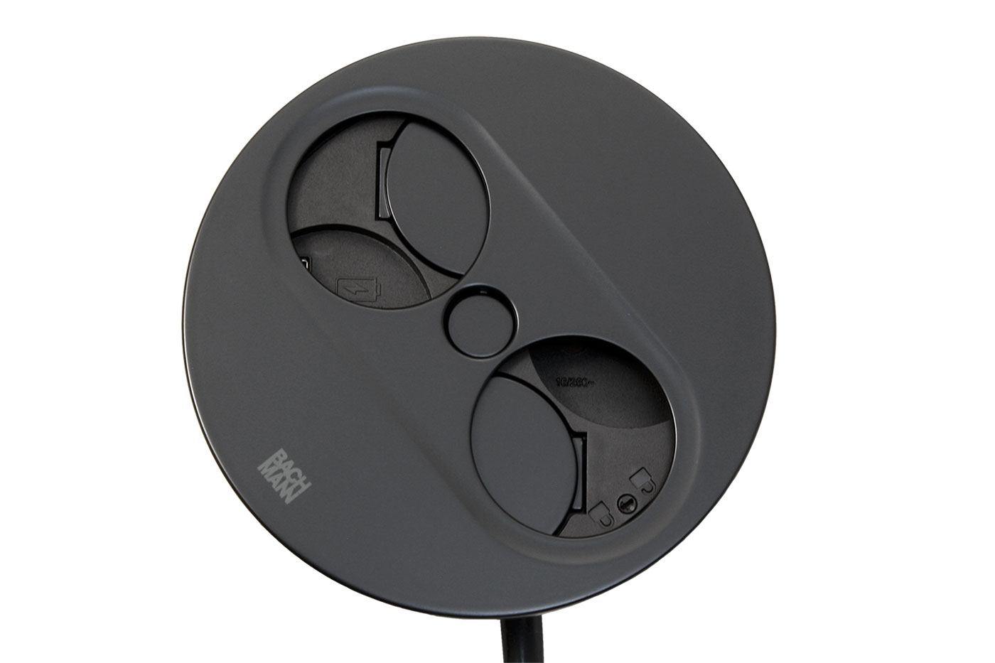 Použití: Box s jednou napájecí zásuvkou a nabíjecími porty, určený pro montáž do desky stolu.;