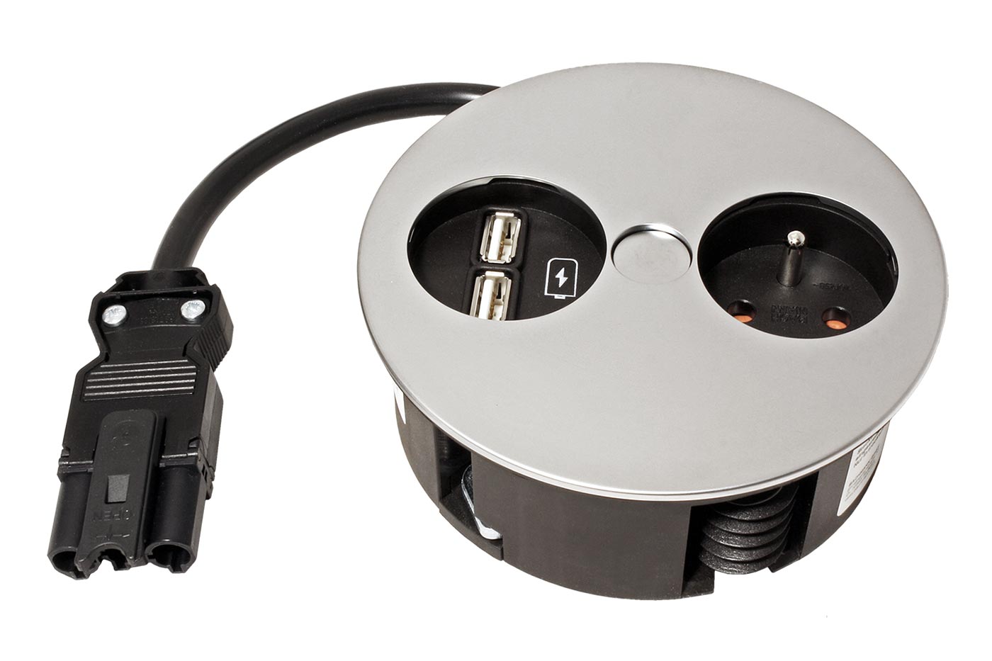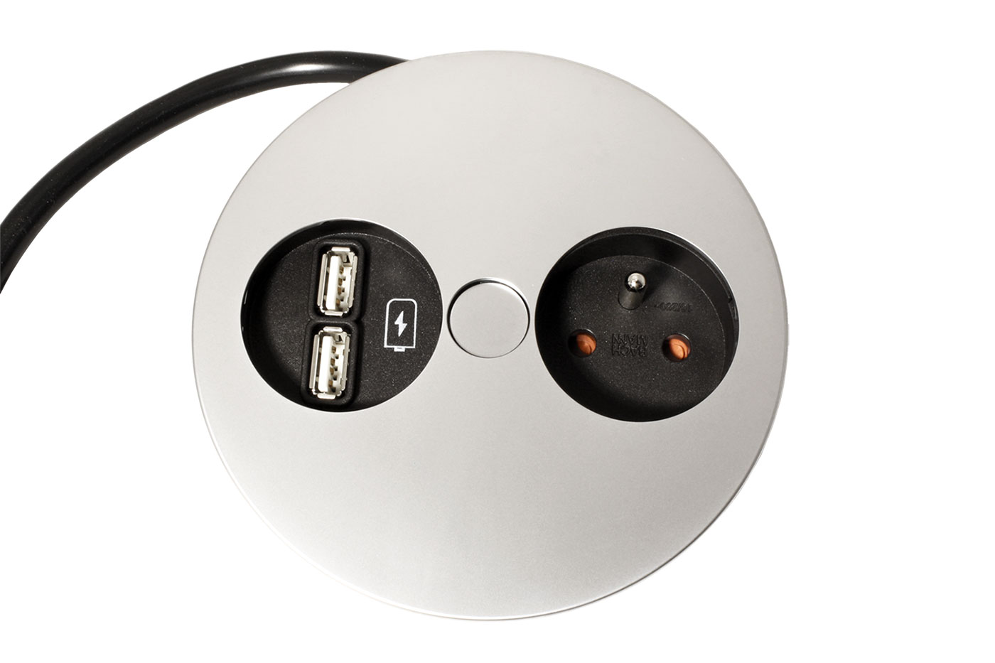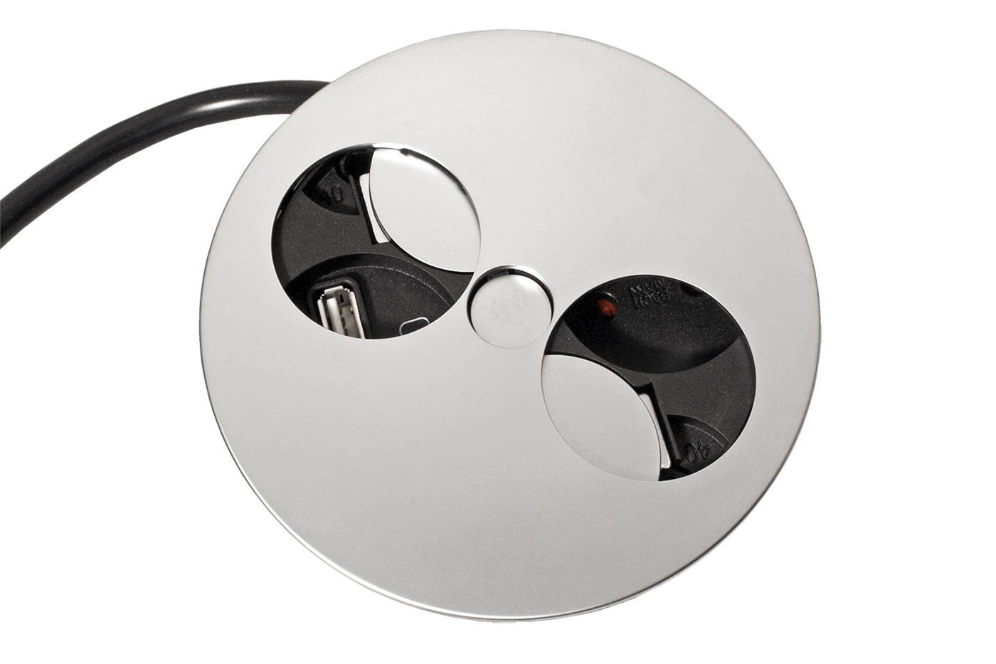 Použití: Box s napájecí zásuvkou 230V a 2 USB porty 5V/3,1A, určený pro montáž do desky stolu.;