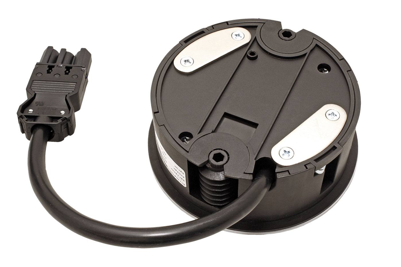 Box s napájecí zásuvkou 230V a 2 USB porty 5V/3,1A, určený pro montáž do desky stolu.