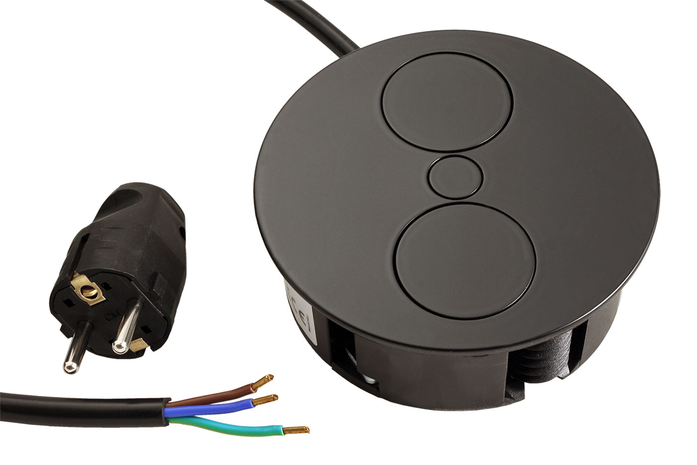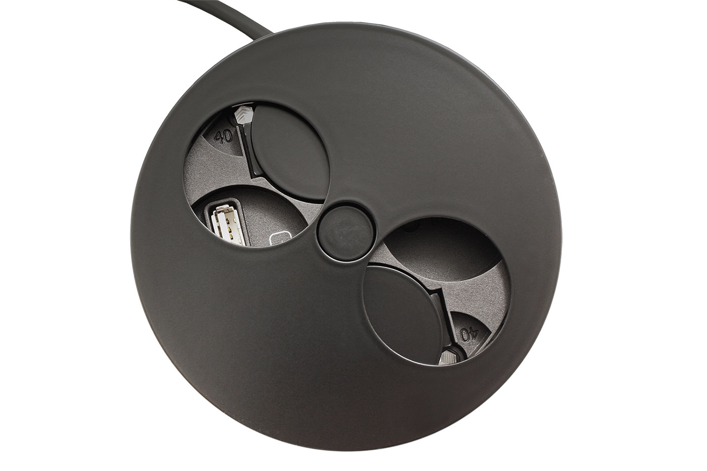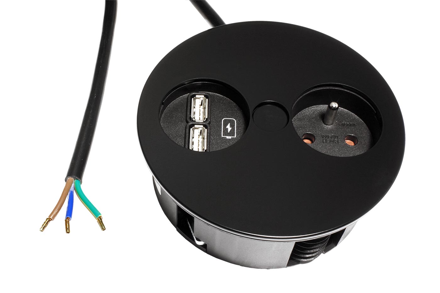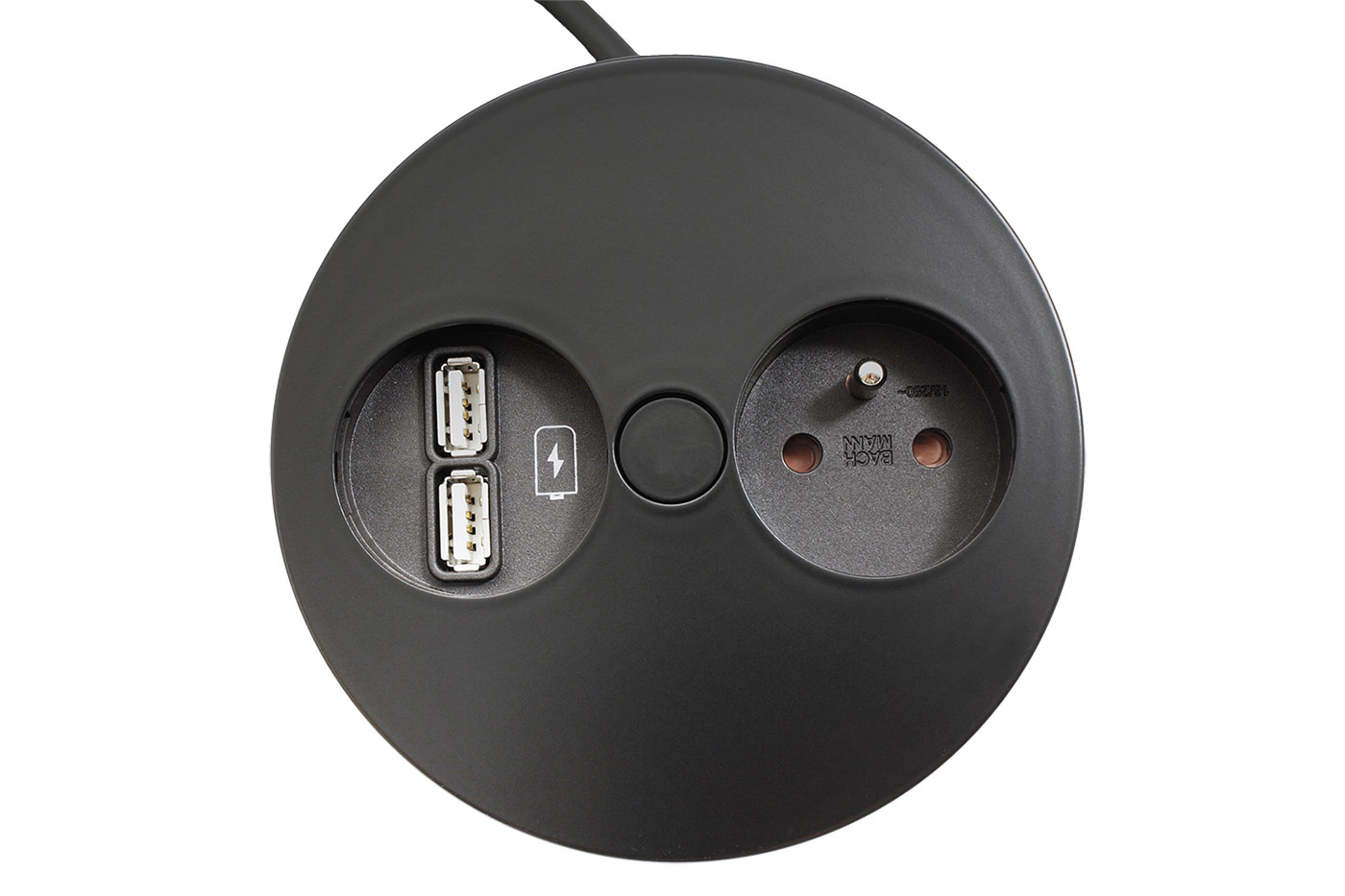 Box s napájecí zásuvkou 230V a 2 USB porty 5V/3,1A, určený pro montáž do desky stolu.