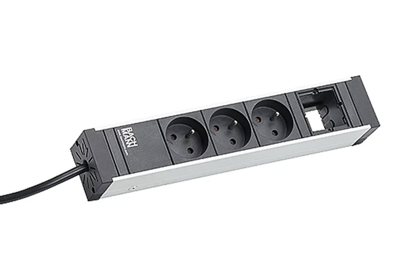 Box se 3 napájecími zásuvkami a 1 volnou pozicí, určený pro přímé použití jako vícenásobná zásuvka, nebo pro montáž pod / nad stůl / do rozvaděče. Je možná kombinace s rámem CONI COVER.