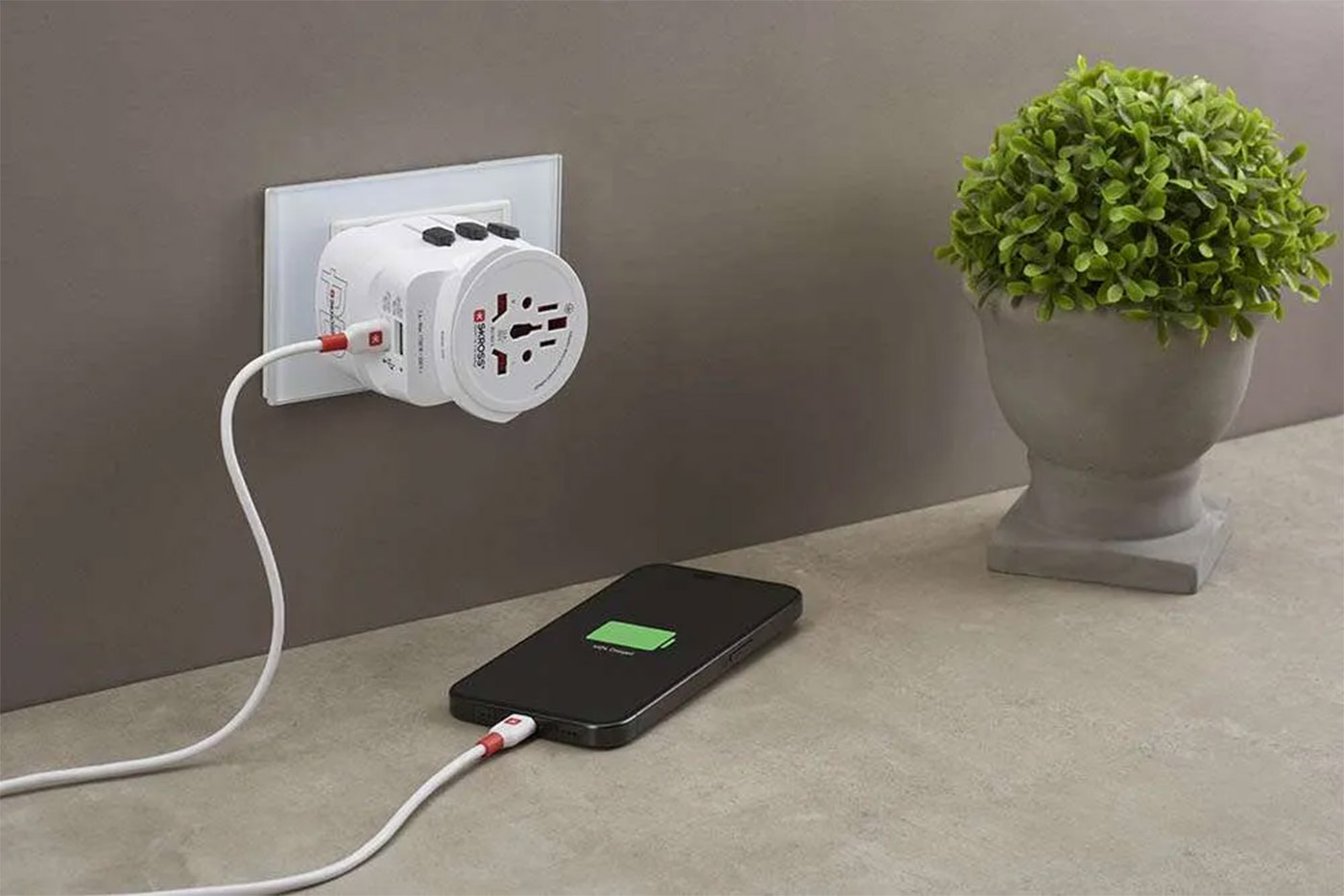 Umožňuje připojit zařízení s různými vidlicemi do zásuvky používané ve Švýcarsku, České republice, Německu, Francii, Itálii, Anglii, USA, Austrálii, Brazílii. Zároveň je možno využít dva USB porty pro nabíjení s podporou Power Delivery na USB C portu a QC na USB A portu.