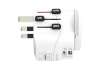 1) univerzální redukce (výstupní adaptér) třípólové vidlice CEE 7/7 (DE, CZ, FR) na třípólovou zásuvku Anglie + Švýcarsko + Itálie + USA + Brazílie + Austrálie a dvoupólovou EU zásuvku.