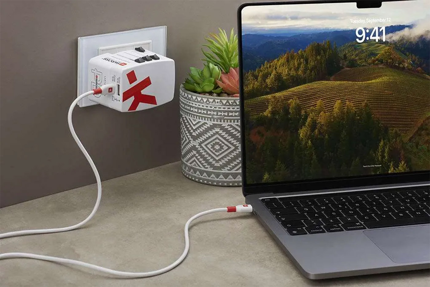 Zdroj je možno připojit do zásuvky používané ve Švýcarsku, České republice, Německu, Francii, Itálii, Anglii, USA, Austrálii, Brazílii. Pro nabíjení je možno využít dva USB porty s podporou Power Delivery 45W na USB C portu a QC na USB A portu.