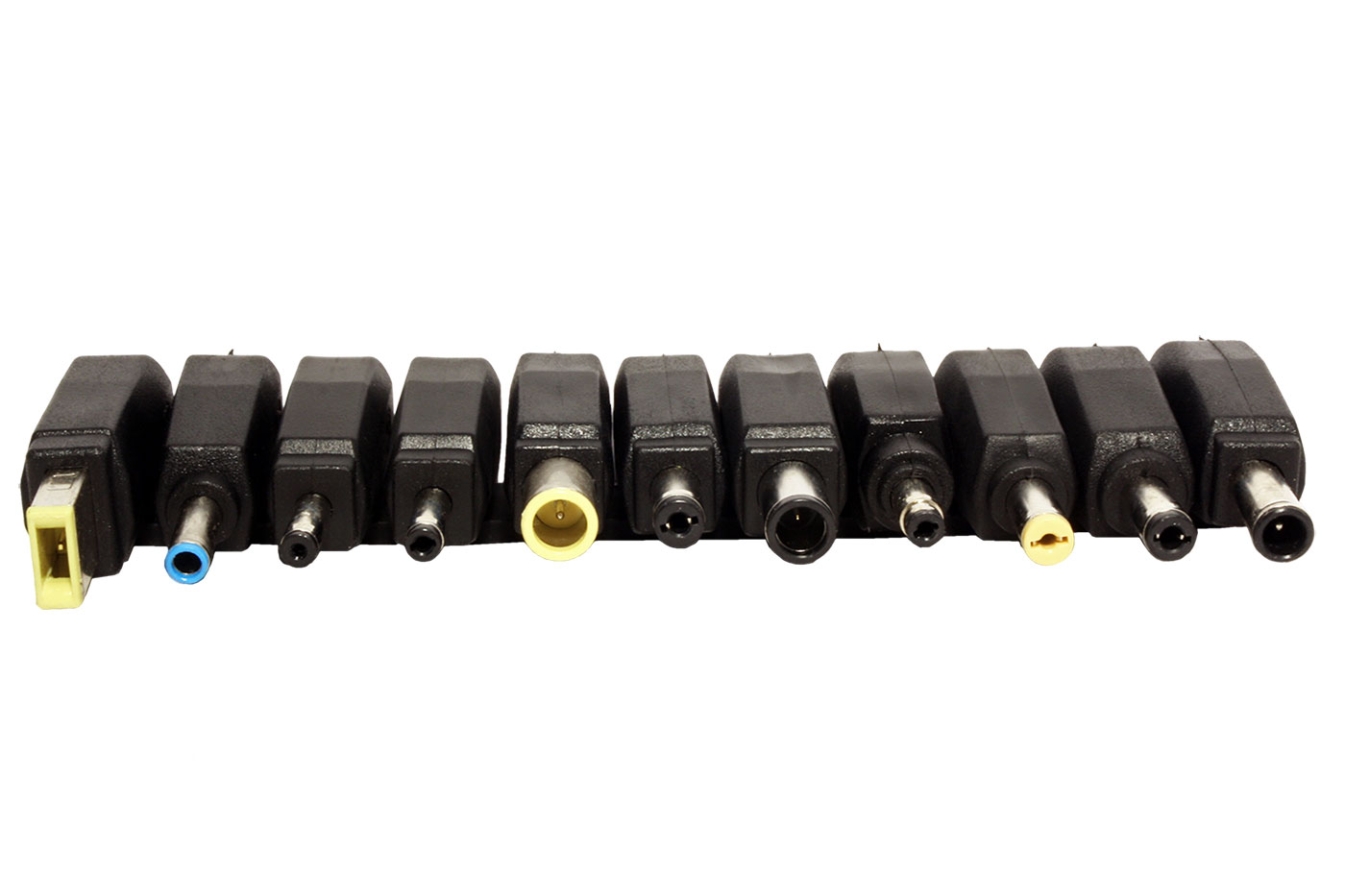 Napájecí adaptér se sadou vyměnitelných koncovek pro různé notebooky.
