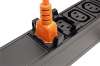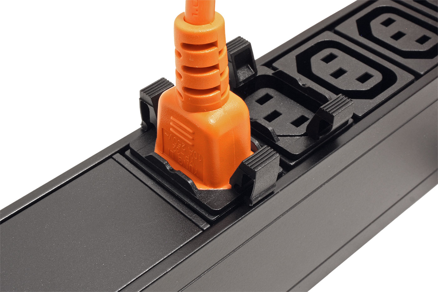 Plastová pojistka zamezující vytržení kabelu s konektorem C14 ze zásuvky.;