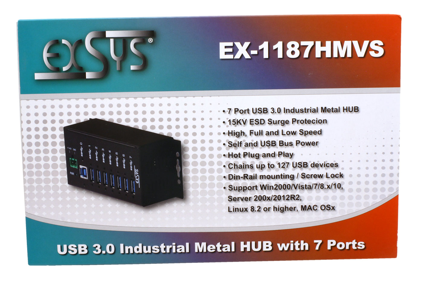 ExSys USB 5Gbps Hub, 7x USB3.0 A(F), kovový, na DIN lištu (EX-1187HMVS)