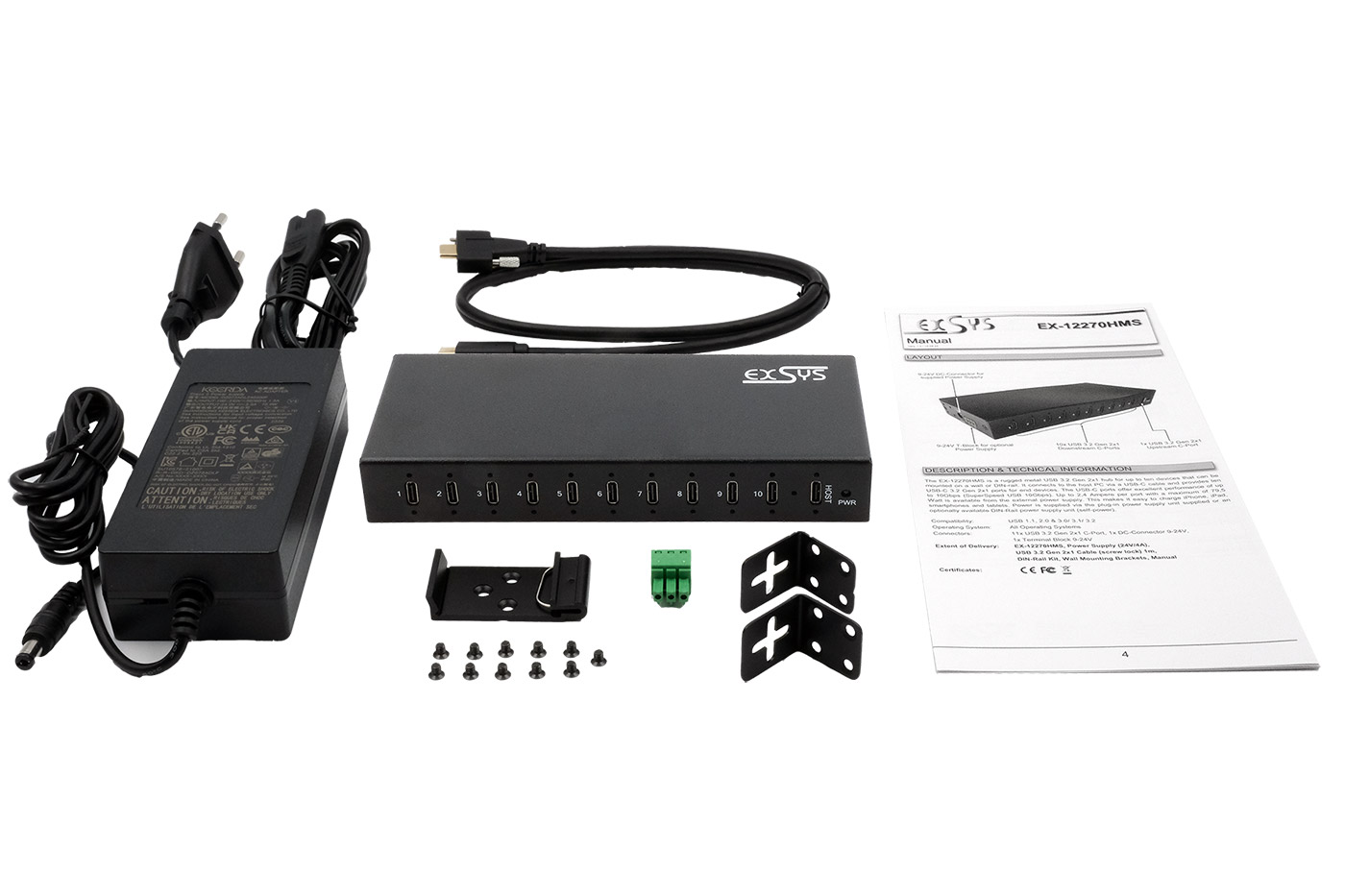 Obsah balení: USB HUB, kabel USB C, napájecí zdroj 24V DC/4A, adaptér na DIN lištu a na stěnu;