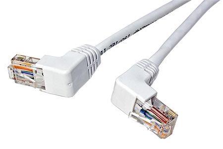 Propojovací kabel pro počítačovou síť s úhlovými konektory.