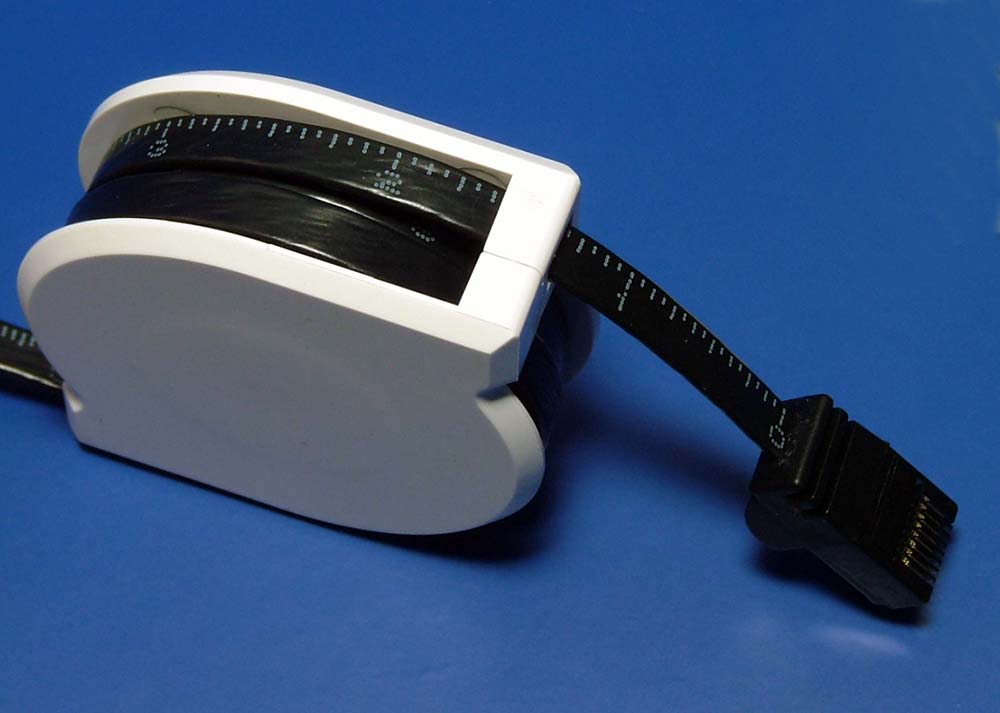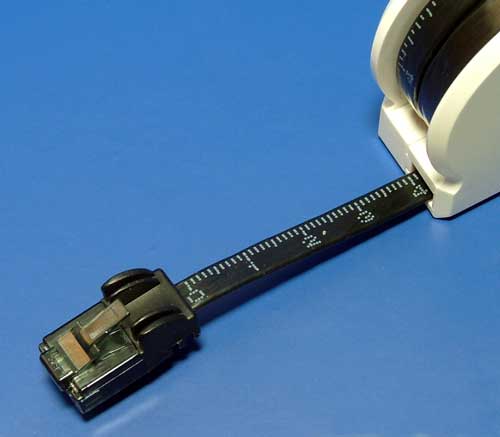 Plochý patch kabel navinutý do přenosného pouzdra.;