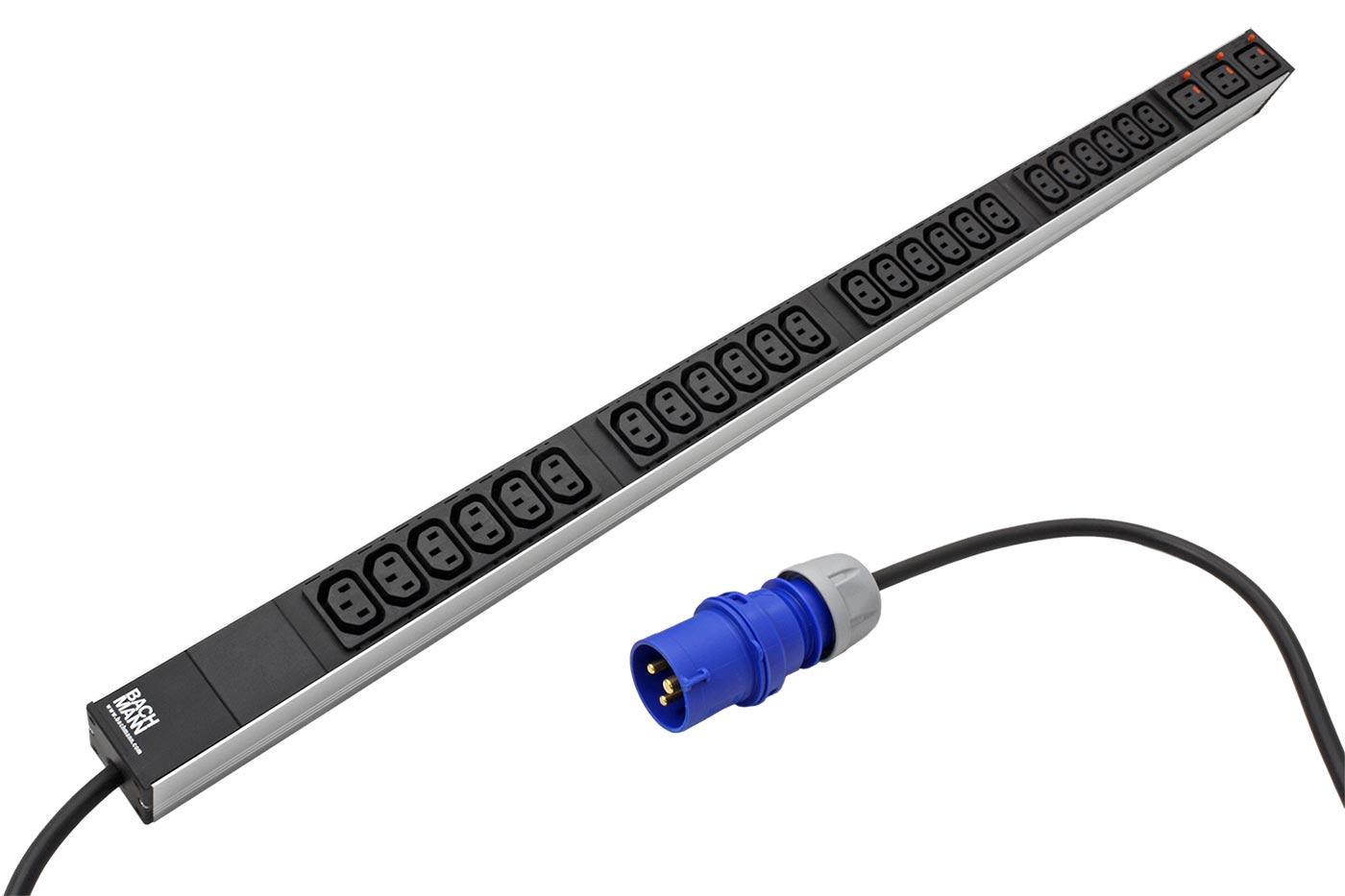 Vertikální napájecí panel vhodný pro montáž do velkých 19" rozvaděčů. S jednofázovou vstupní vidlicí IEC60309 16A (modrá).
