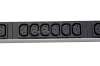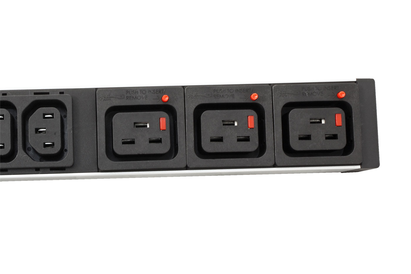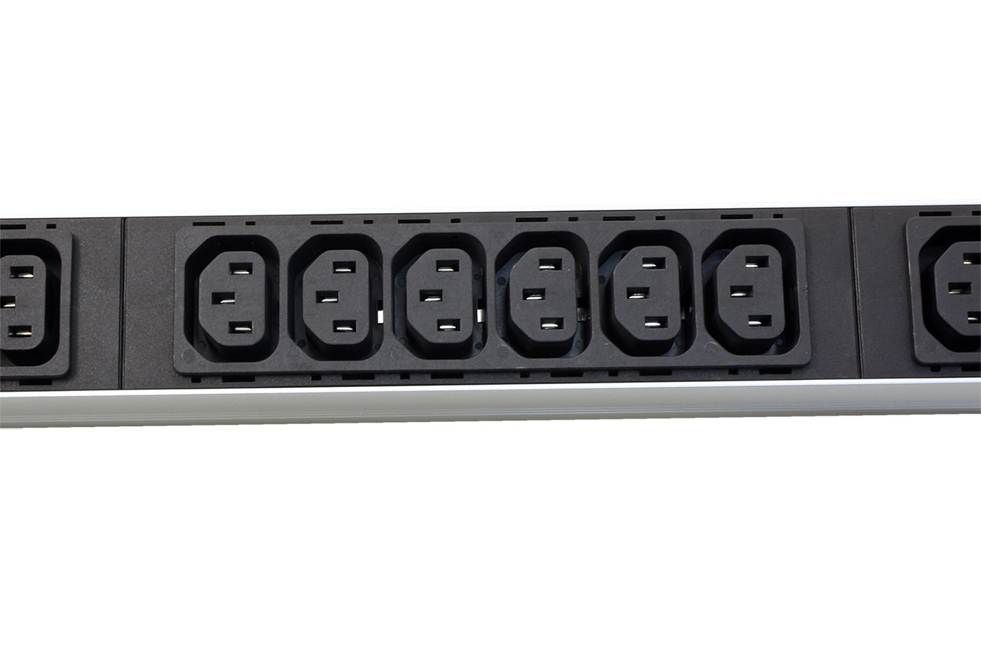 Jednofázový vertikální napájecí panel se 24 zásuvkami IEC320/C13 a 3 zásuvkami IEC320/C19.;