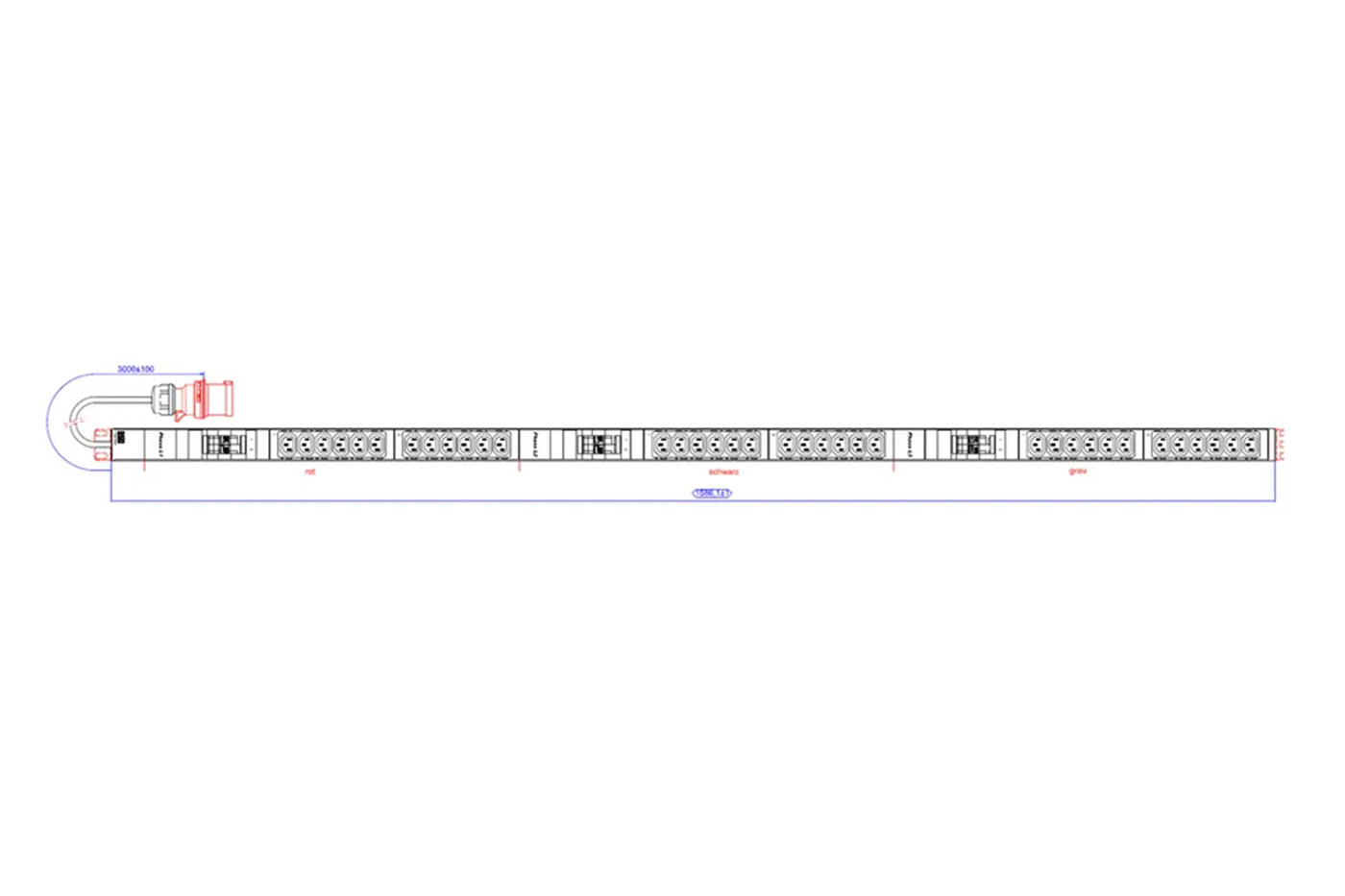 Vertikální napájecí panel vhodný pro montáž do velkých 19" rozvaděčů a pro napájení zařízení s odběrem až 10A s třífázovou vstupní vidlicí IEC60309 3x 32A (červená).