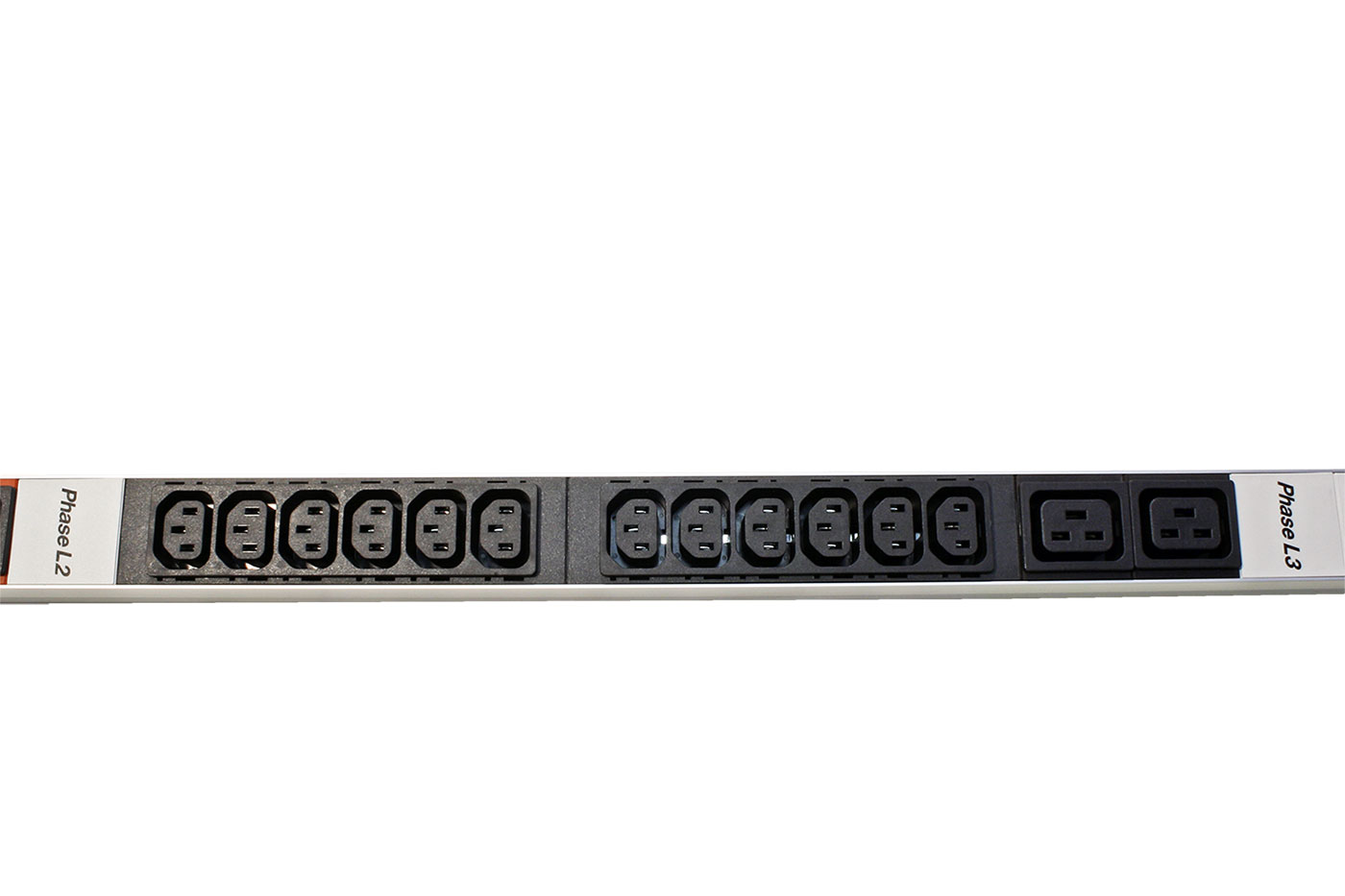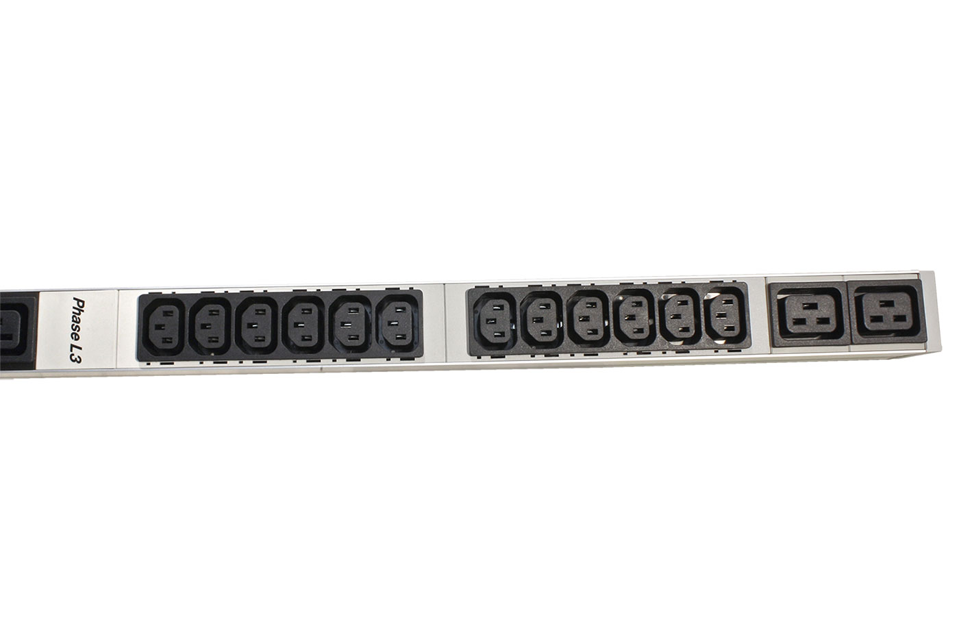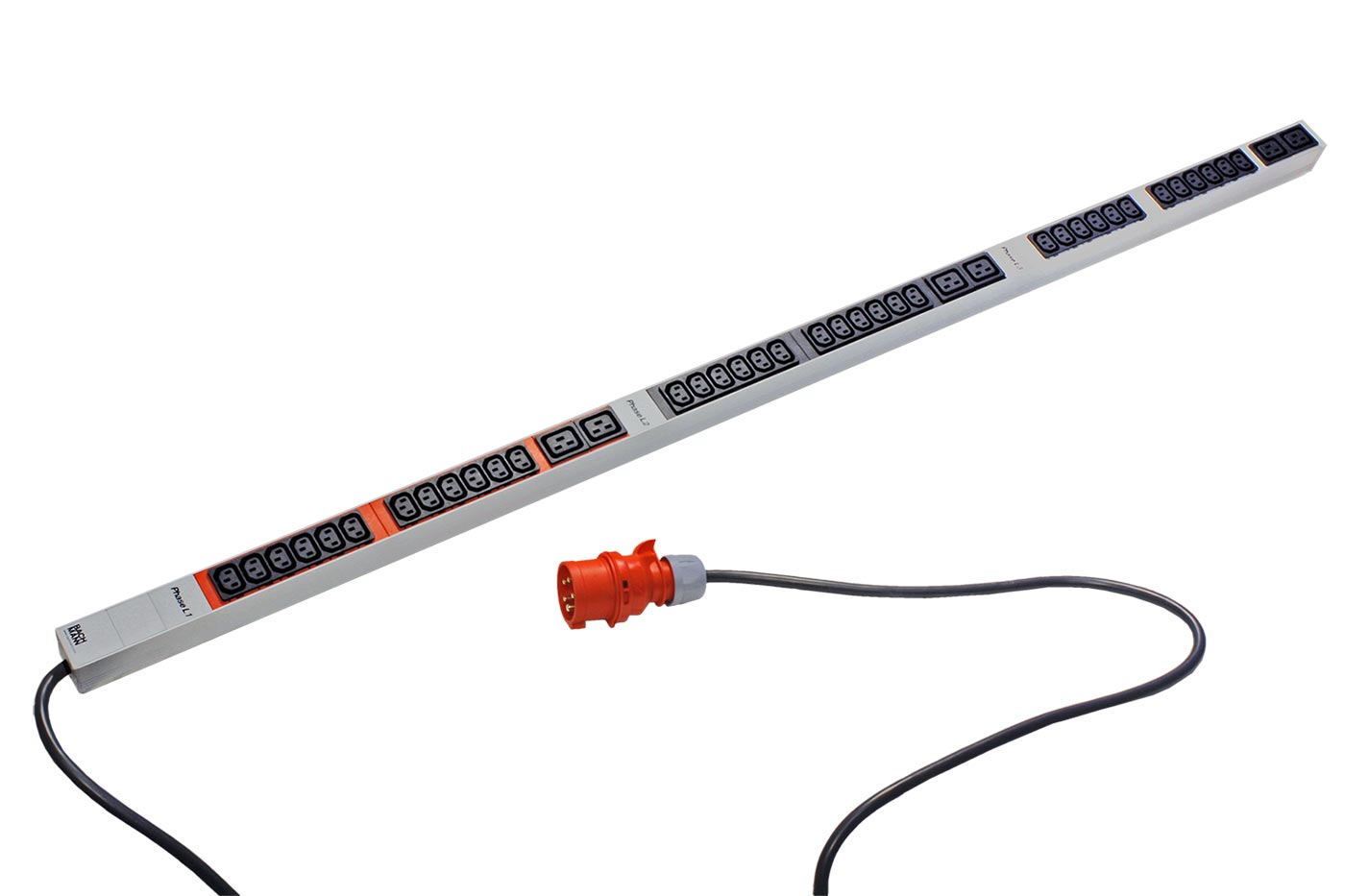 Vertikální napájecí panel vhodný pro montáž do velkých 19" rozvaděčů. S třífázovou vstupní vidlicí IEC60309 16A (červená). Zásuvky jsou rozděleny celkem do 3 segmentů (podle fází) po 12x IEC320/C13 + 2x IEC320/C19.
