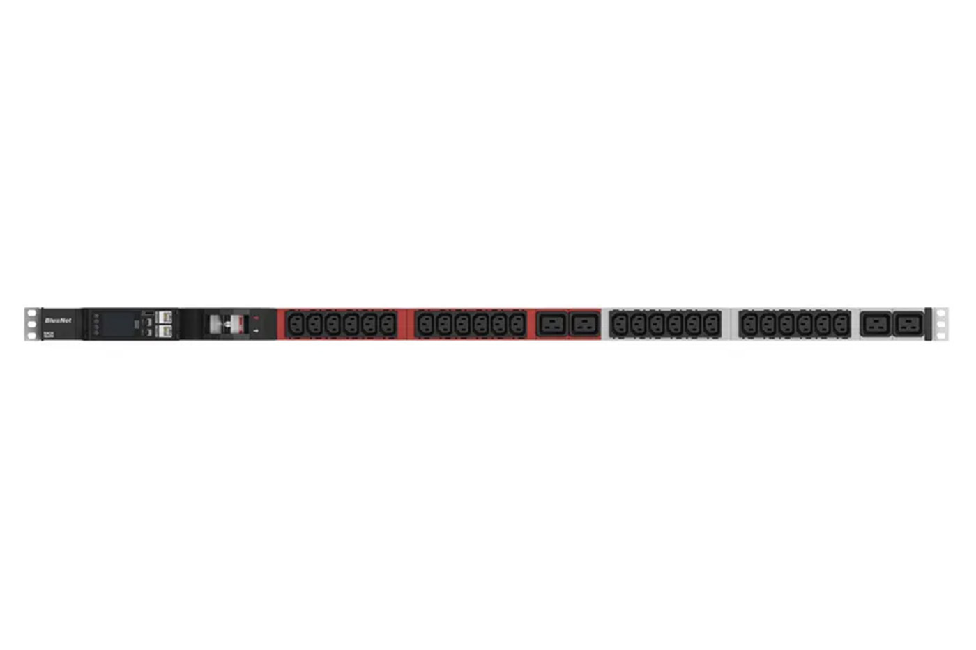 Vertikální napájecí panel systému BlueNet BN ESSENTIAL se 24 zásuvkami C13 a 4x C19 a centrálním měřením na fázi základních elektrických veličin.;