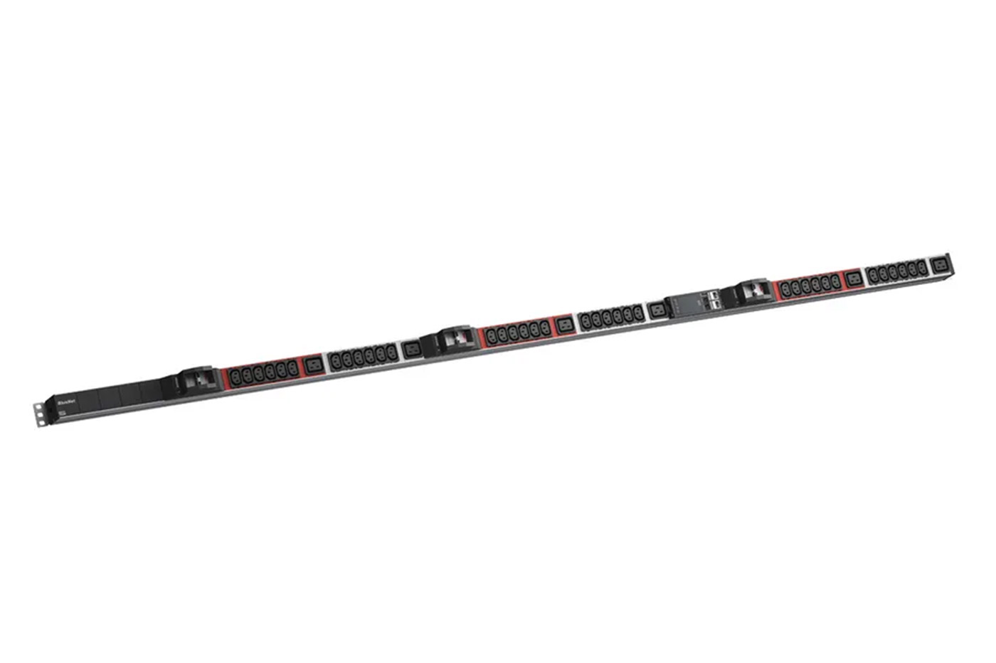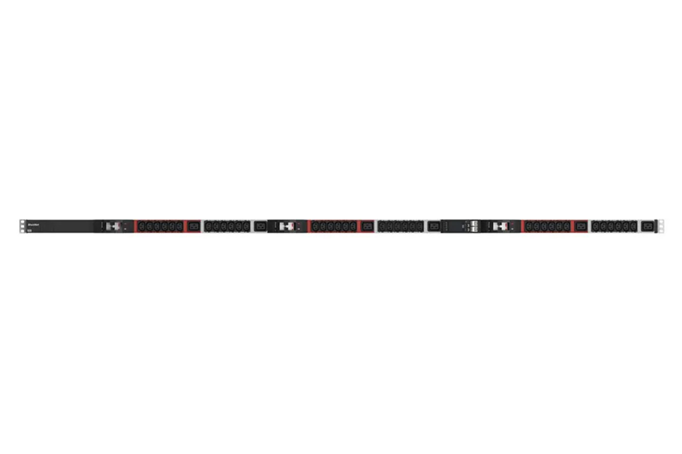 Vertikální napájecí panel systému BlueNet BN ESSENTIAL se 36 zásuvkami C13 a 6x C19 a centrálním měřením na fázi základních elektrických veličin.